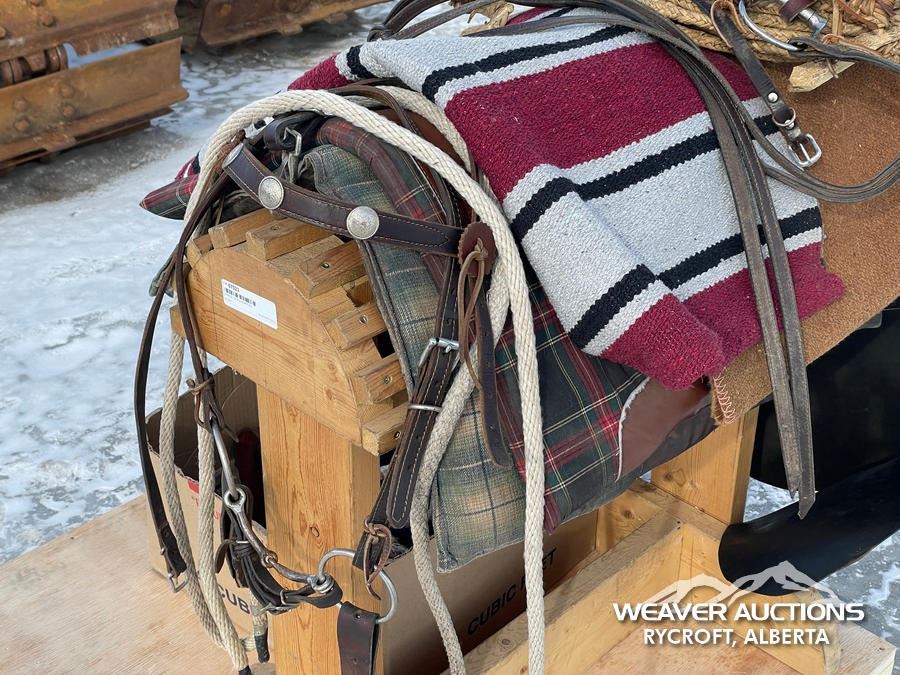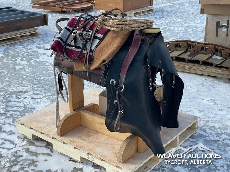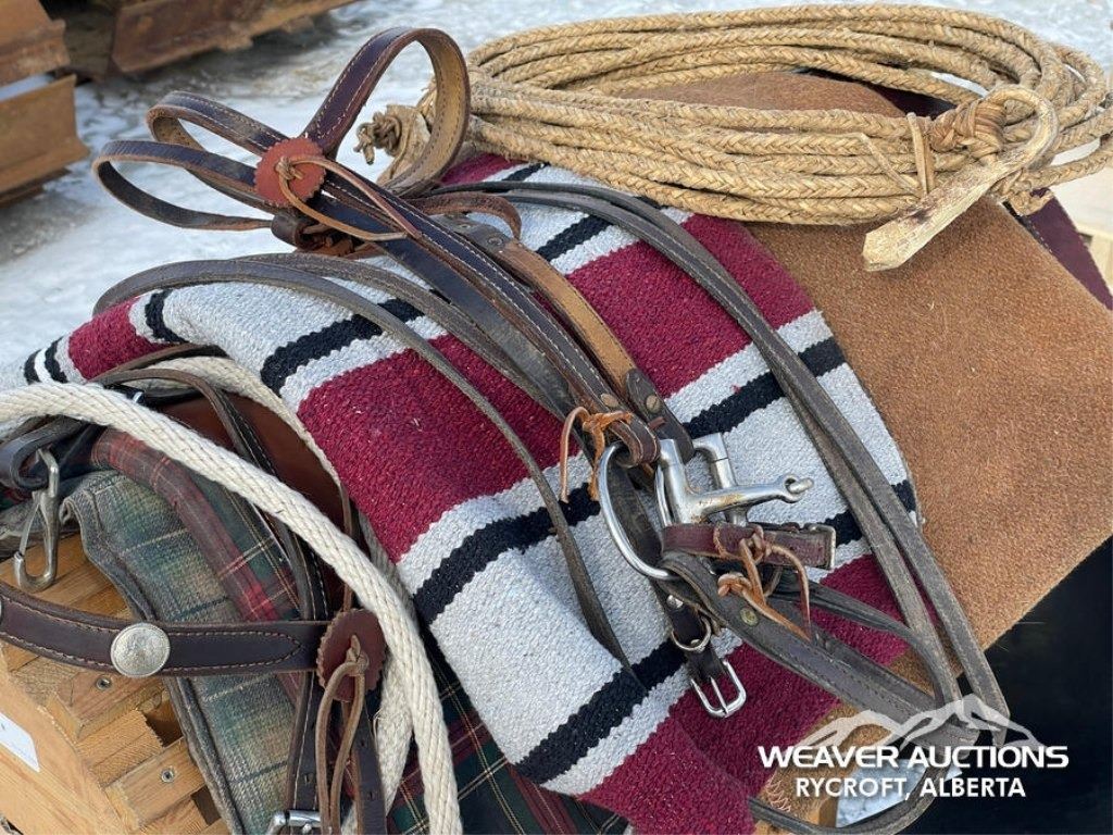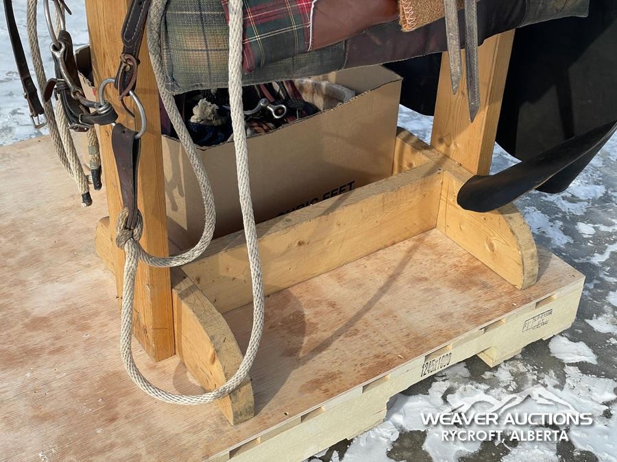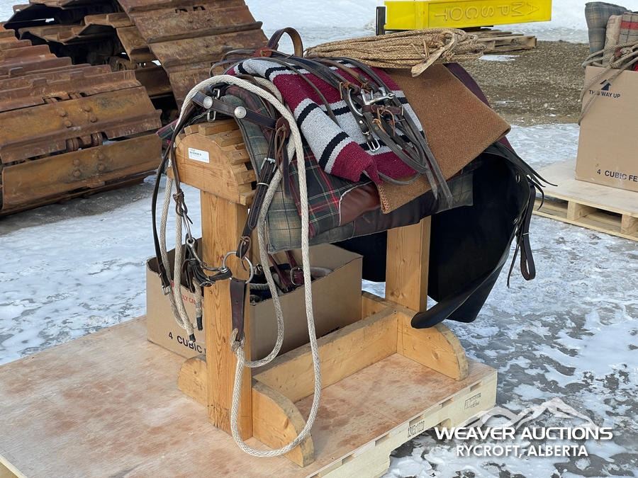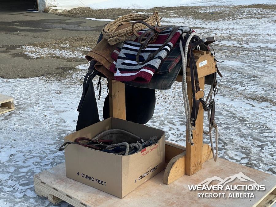 Specifications: WOODEN SADDLE RACK, (2) SADDLE PADS, (1) SADDLE BLANKET, LEATHER CHAPS, (2) LEATHER BRIDLES W/SNAFFLE BITS, ASSORTED LEATHER AND CANVAS SADDLE COMPONANTS, (2) ROPE HALTERS W/LEAD ROPES, (1) LARRIAT, (1) UNUSED BREAST COLLAR