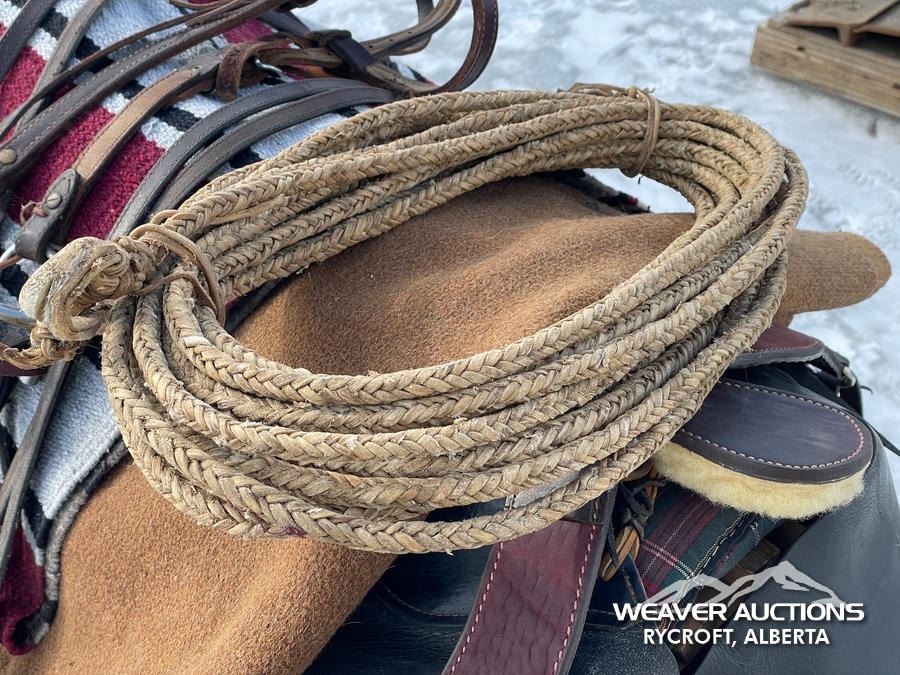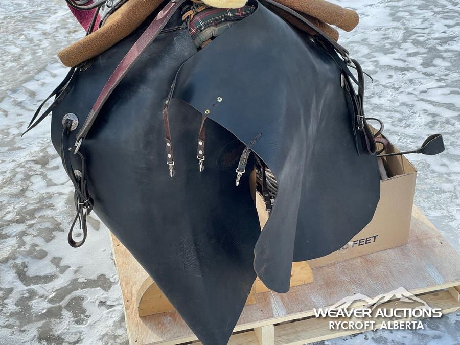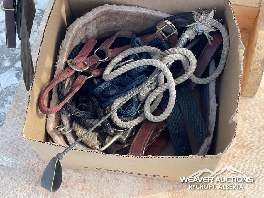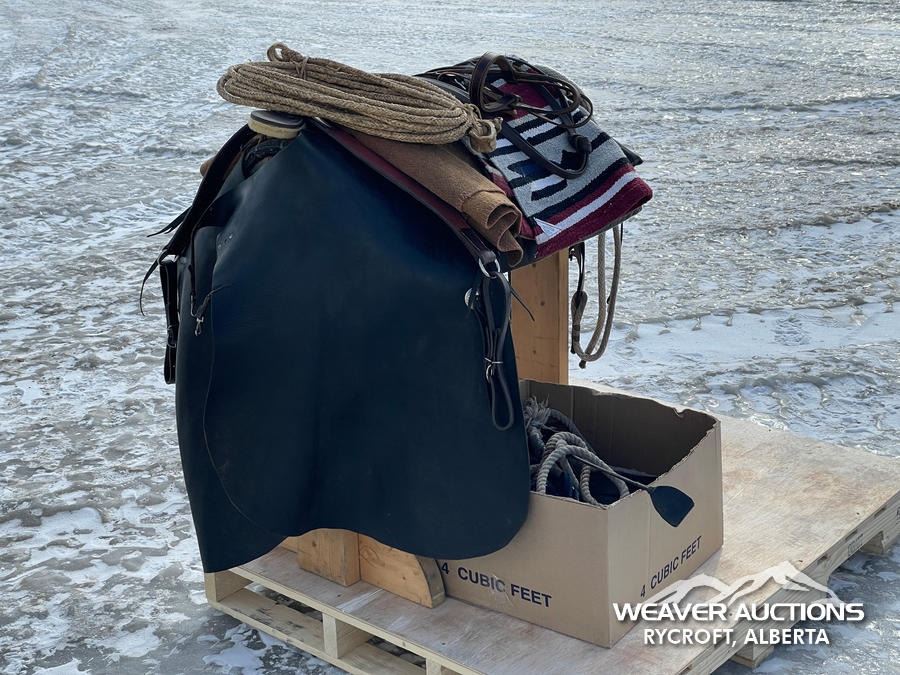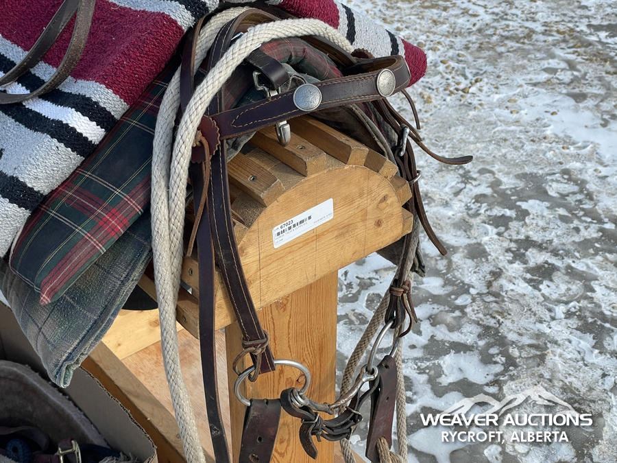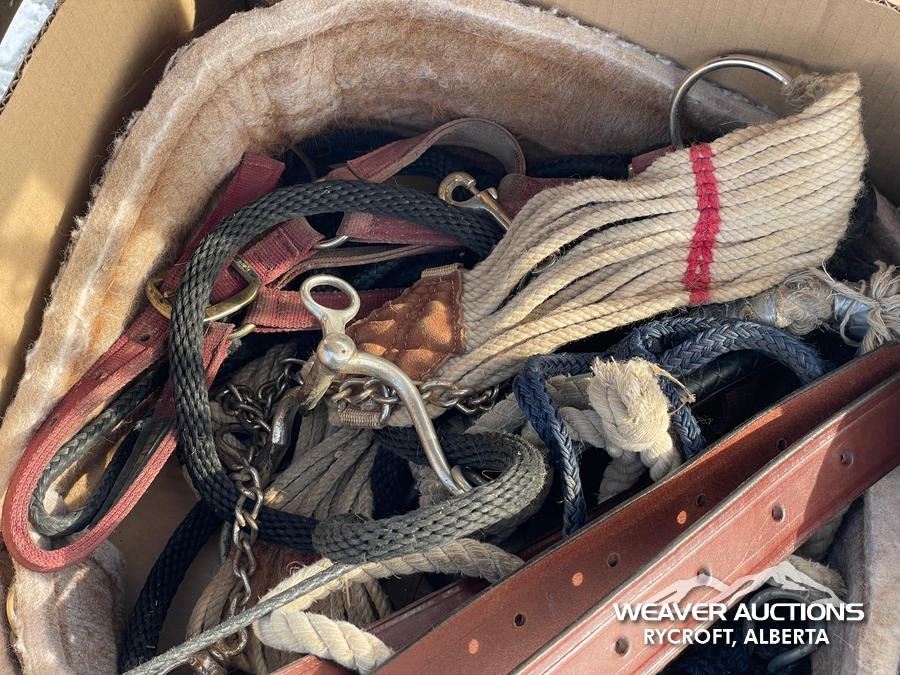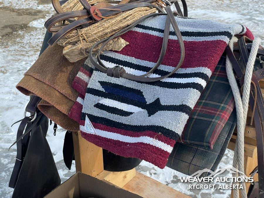 Specifications: WOODEN SADDLE RACK, (2) SADDLE PADS, (1) SADDLE BLANKET, LEATHER CHAPS, (2) LEATHER BRIDLES W/SNAFFLE BITS, ASSORTED LEATHER AND CANVAS SADDLE COMPONANTS, (2) ROPE HALTERS W/LEAD ROPES, (1) LARRIAT, (1) UNUSED BREAST COLLAR