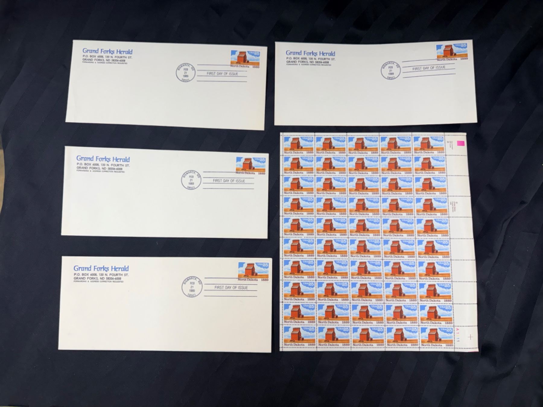 FOUR ENVELOPES (FIRST DAY COVERS) AND ONE FULL SHEET OF NORTH DAKOTA COMMEMORATIVE POSTAGE STAMPS