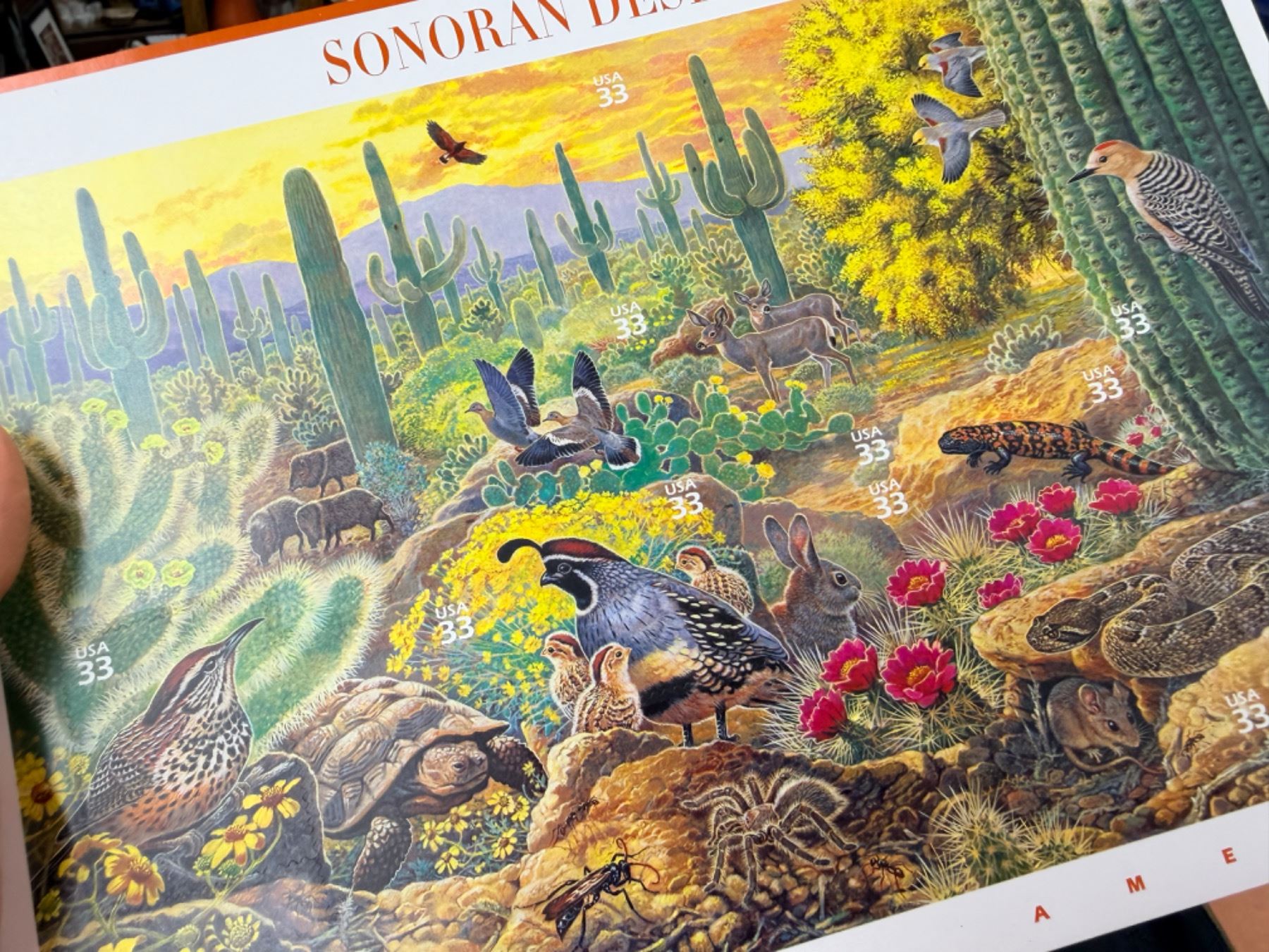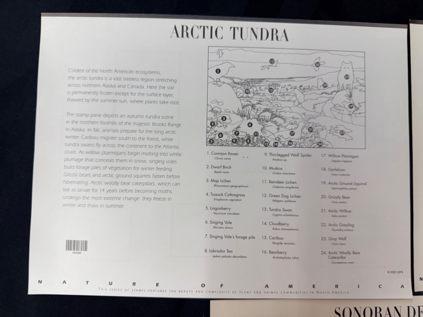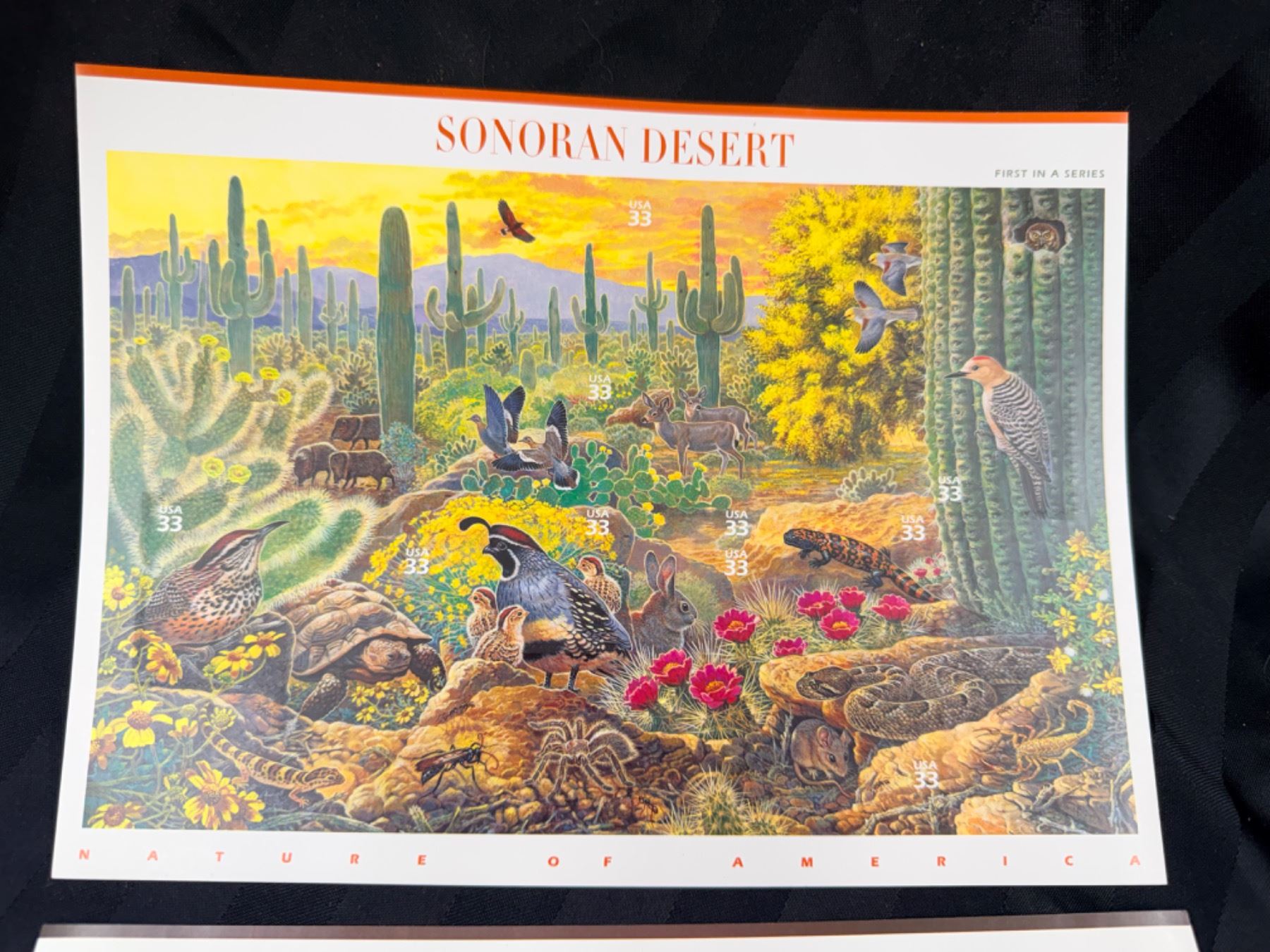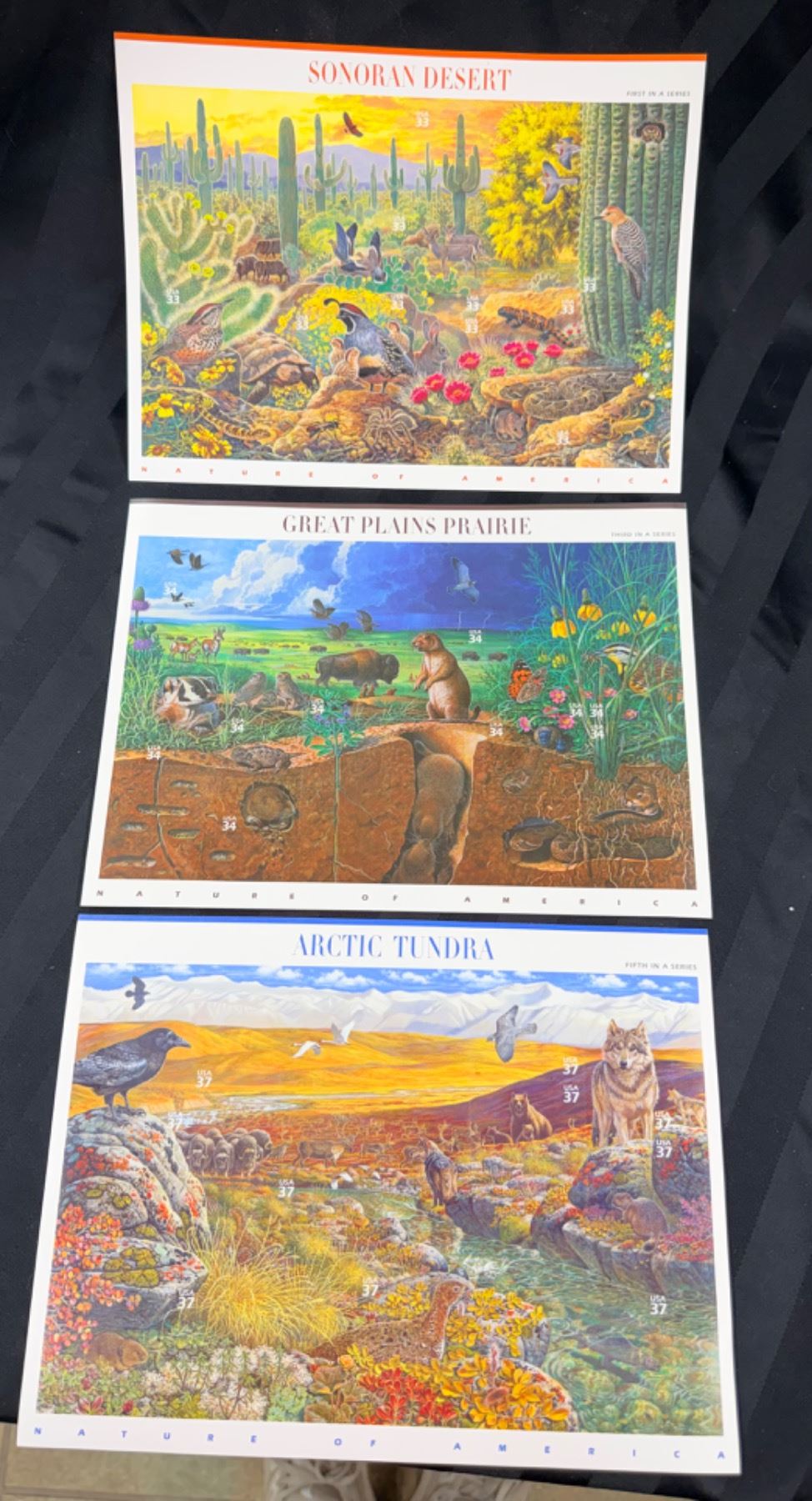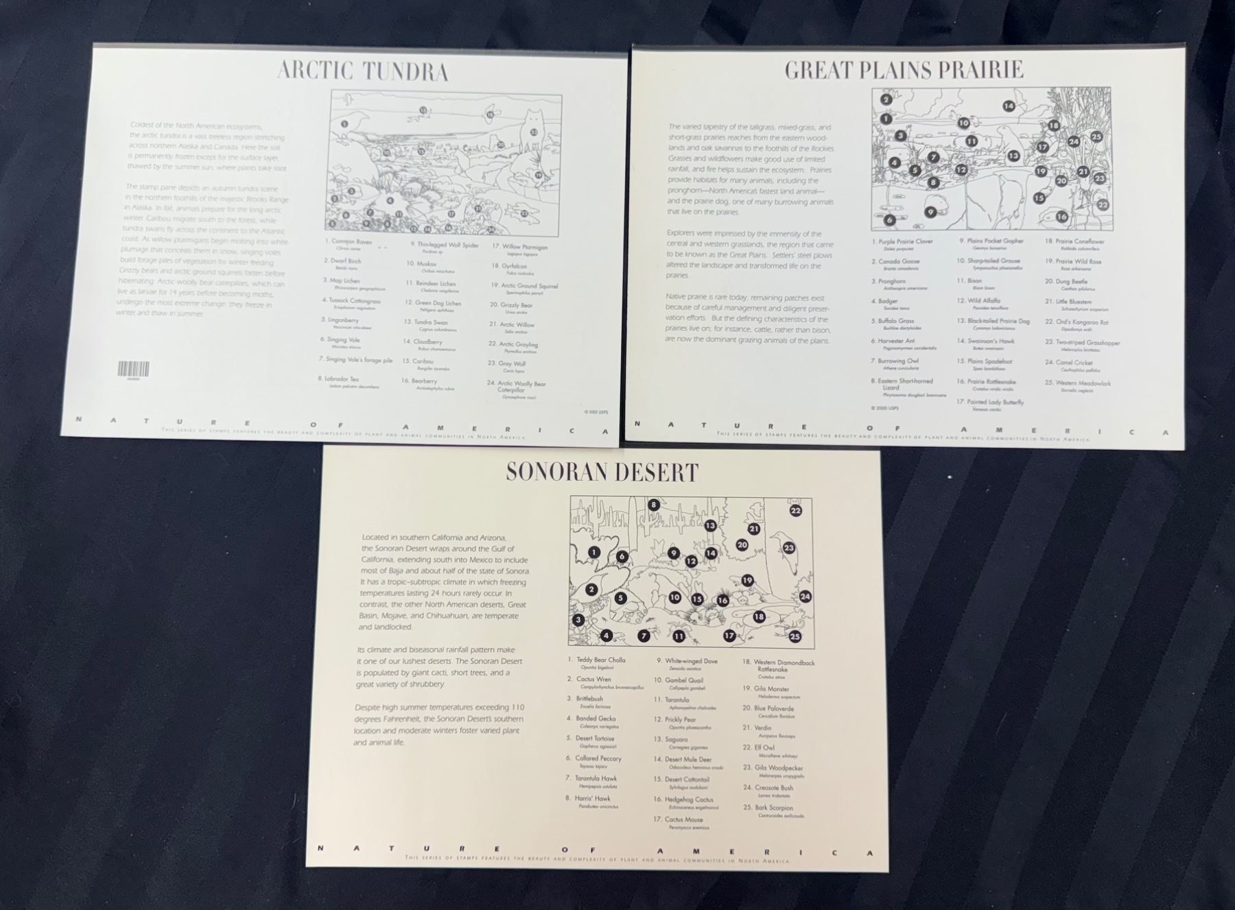 THE TOP SHEET IS THE 1999 33-CENT SONORAN DESERT STAMP SHEET (SCOTT #3293); THE MIDDLE SHEET IS THE 2000 33-CENT GREAT PLAINS PRAIRIE STAMP SHEET; THE BOTTOM SHEET IS THE 2003 37-CENT ARCTIC TUNDRA STAMP SHEET (SCOTT #3802)