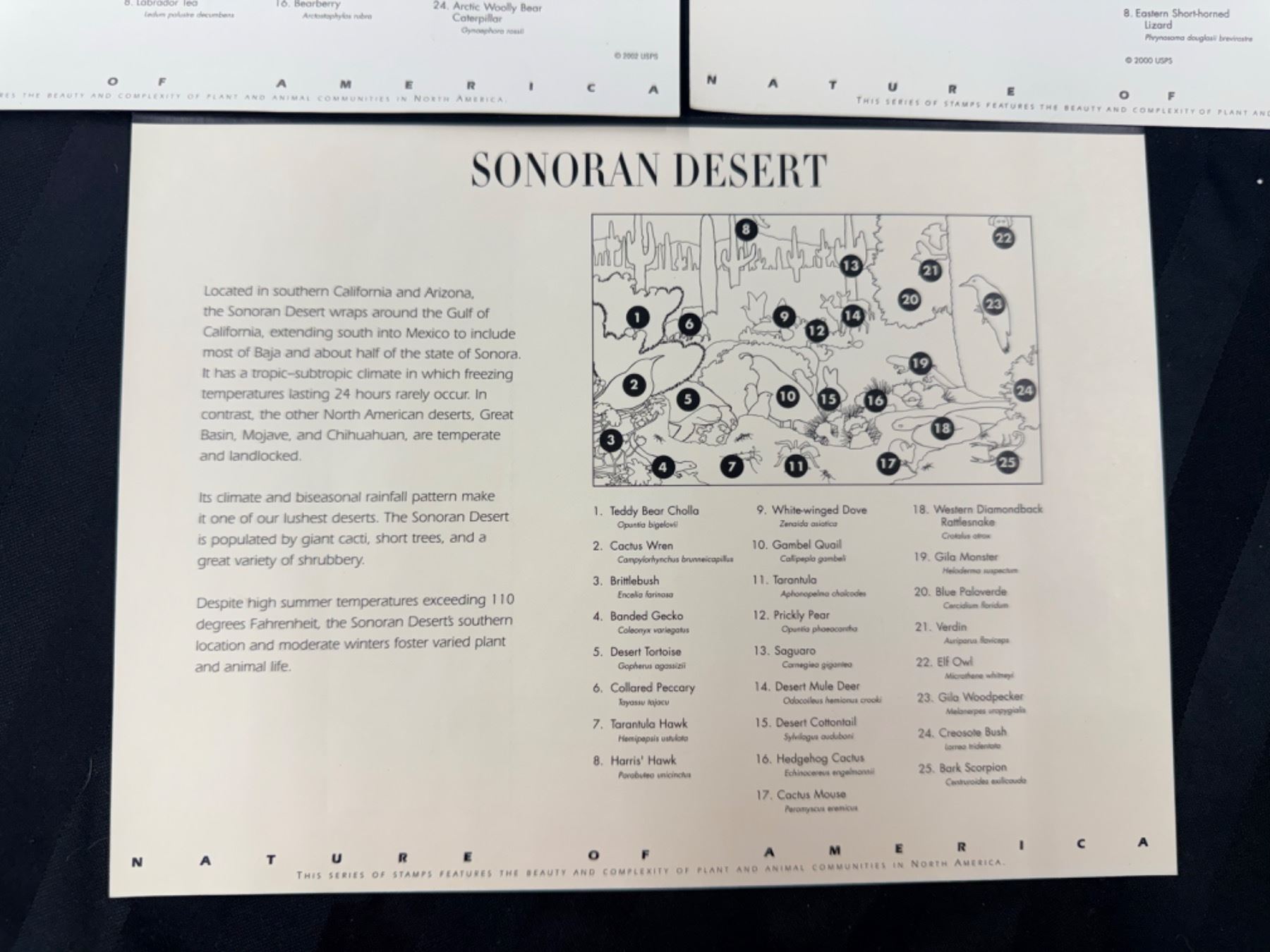 NATURE OF AMERICA IS A SERIES OF TWELVE SELF-ADHESIVE STAMP SHEETS THAT THE UNITED STATES POSTAL SERVICE RELEASED ANNUALLY BETWEEN 1999 AND 2010 STARTING WITH THE SONORAN DESERT SHEET AND ENDING WITH THE HAWAIIAN RAIN FOREST SHEET