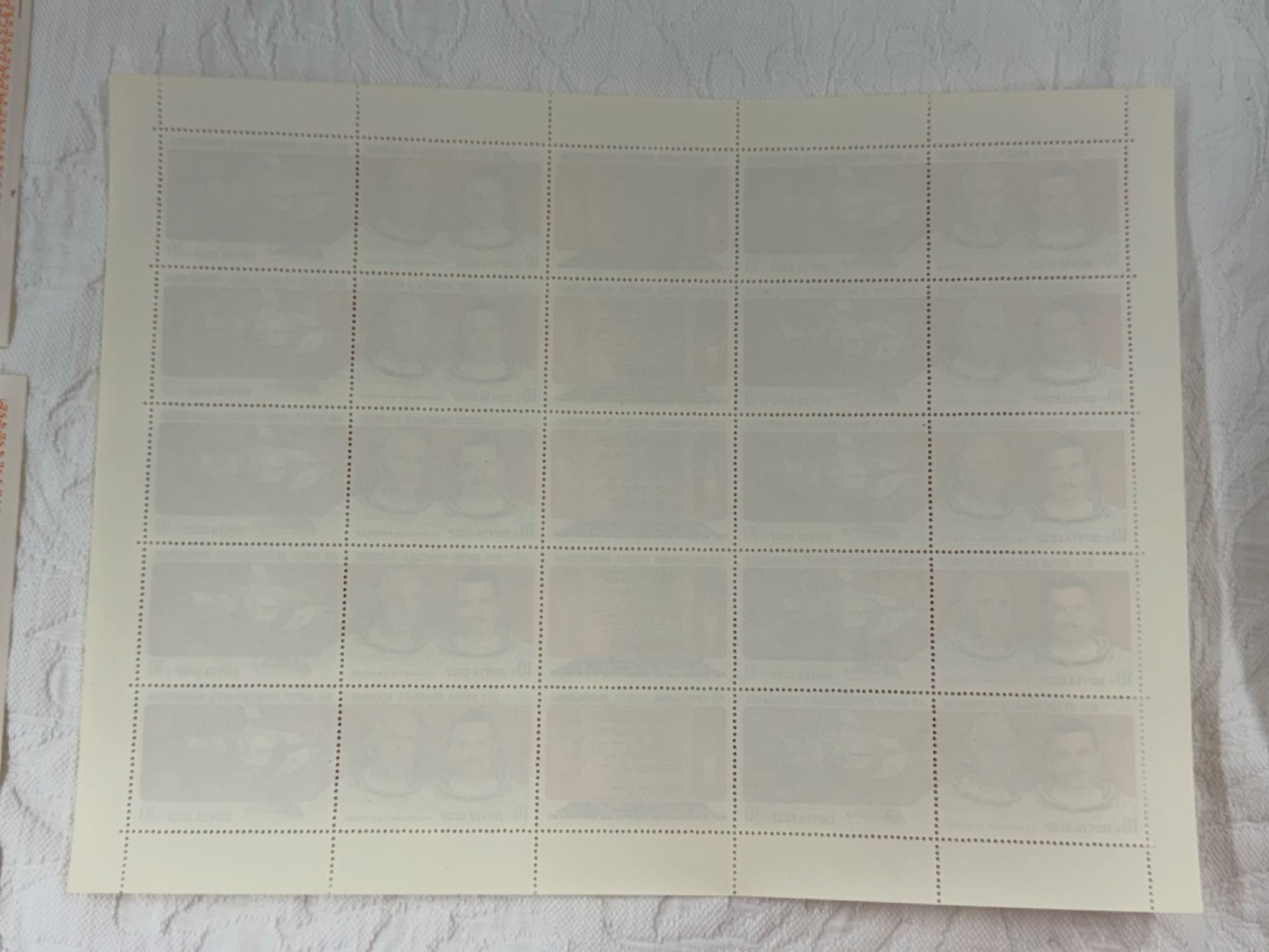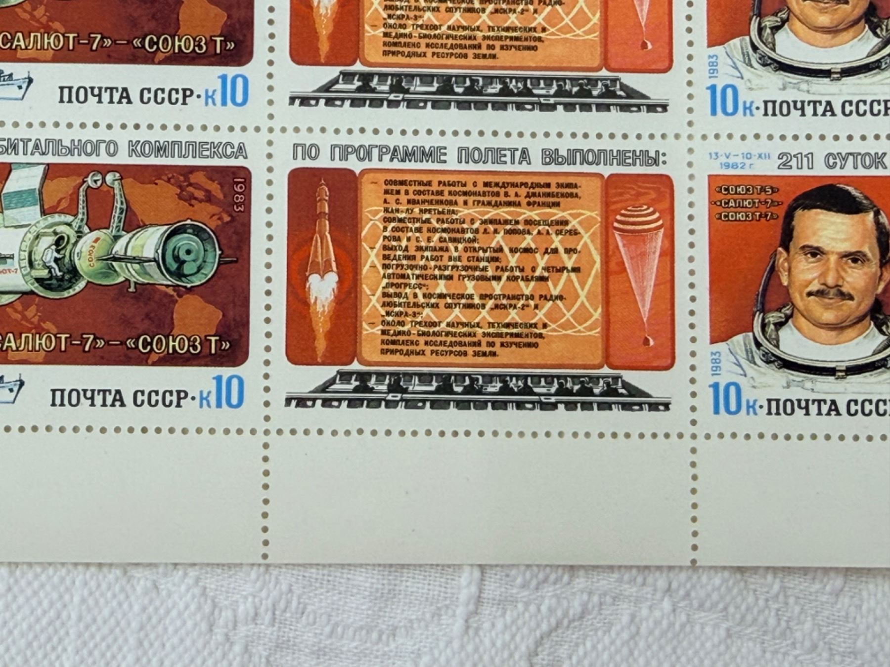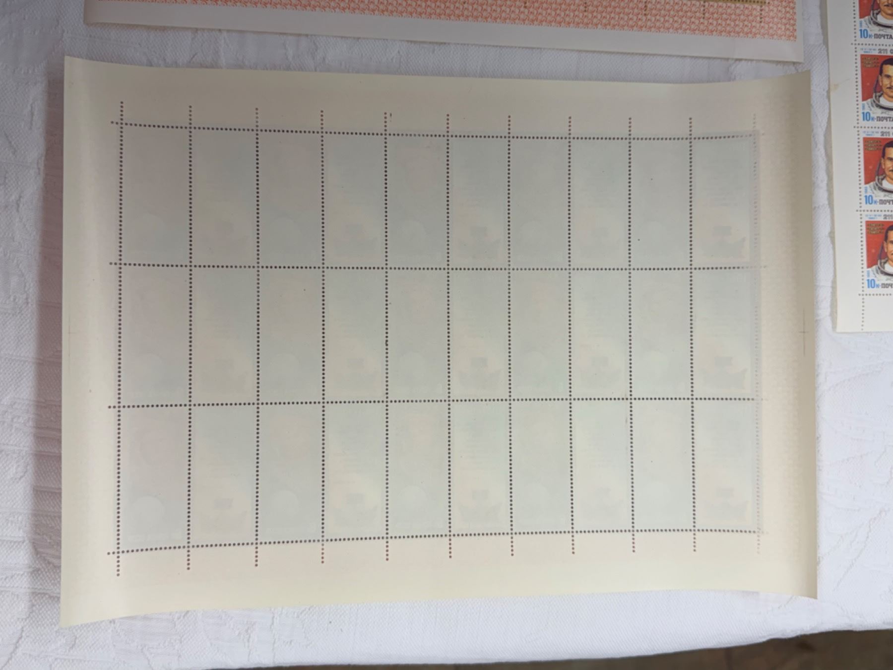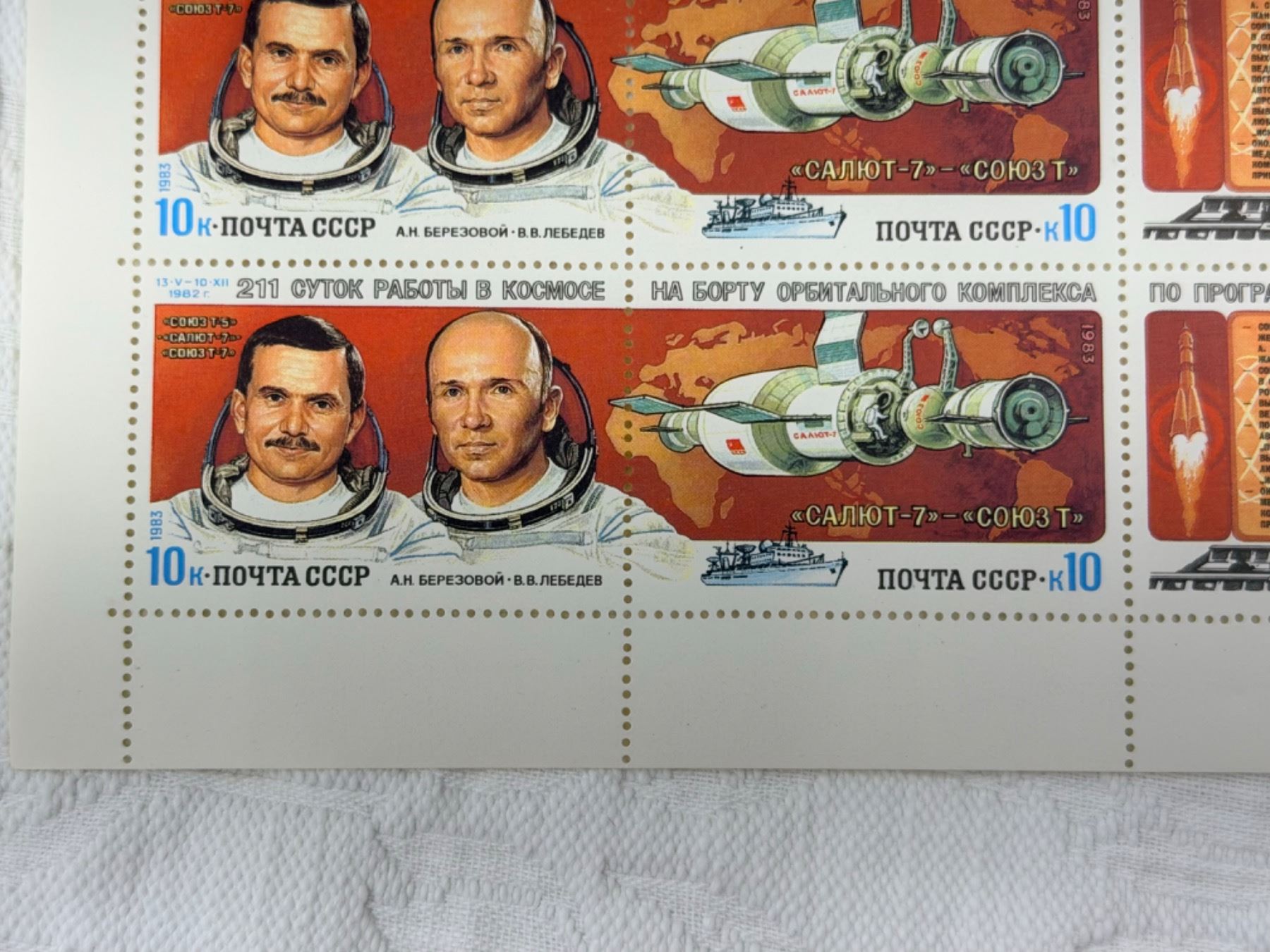 A LARGE SHEET OF 30 STAMPS, EACH VALUED AT 6 KOPEKS, FEATURING A STYLIZED PORTRAIT OF A COSMONAUT IN A HELMET, THE SOVIET FLAG, AND A ROCKET LAUNCH