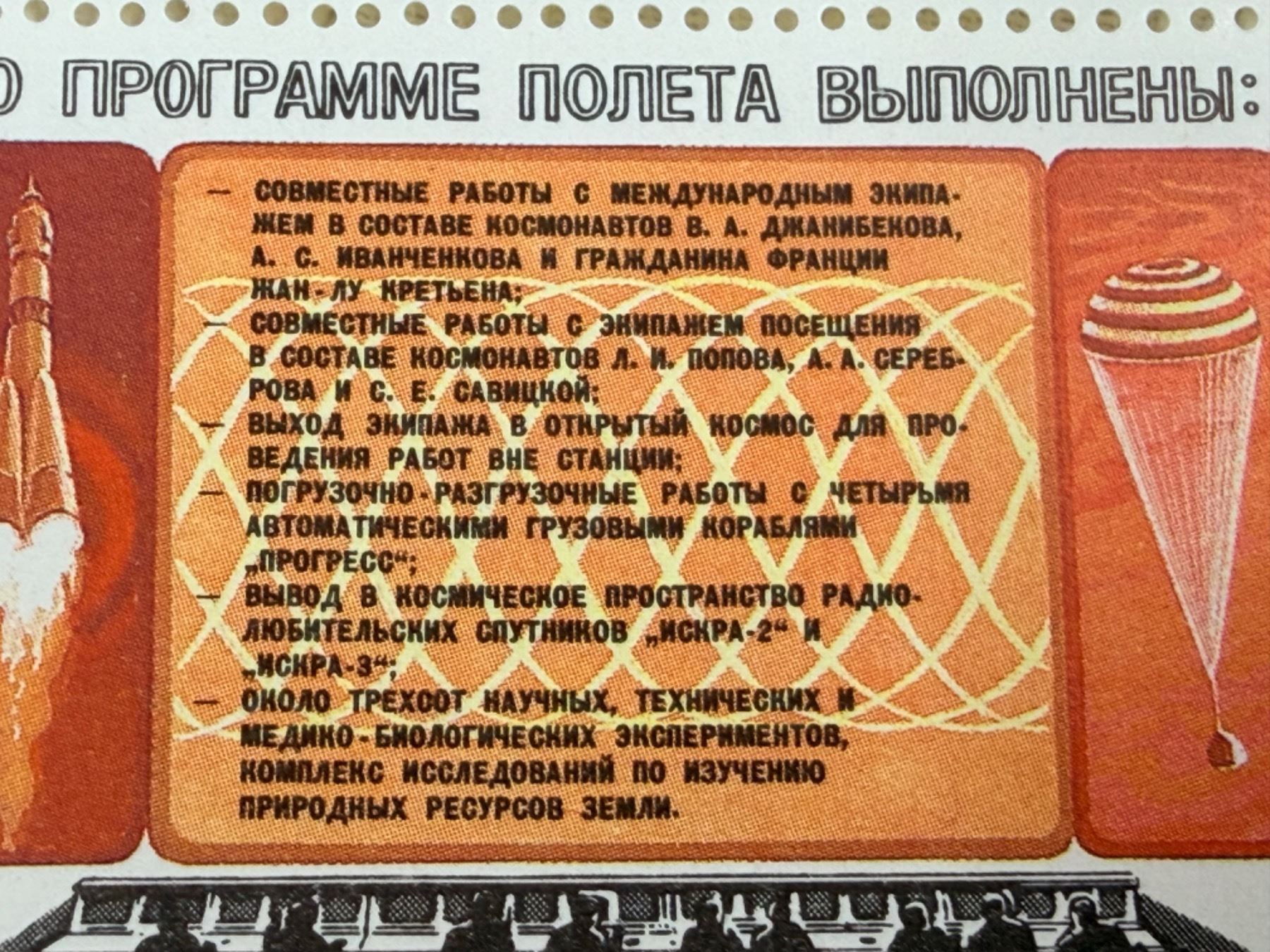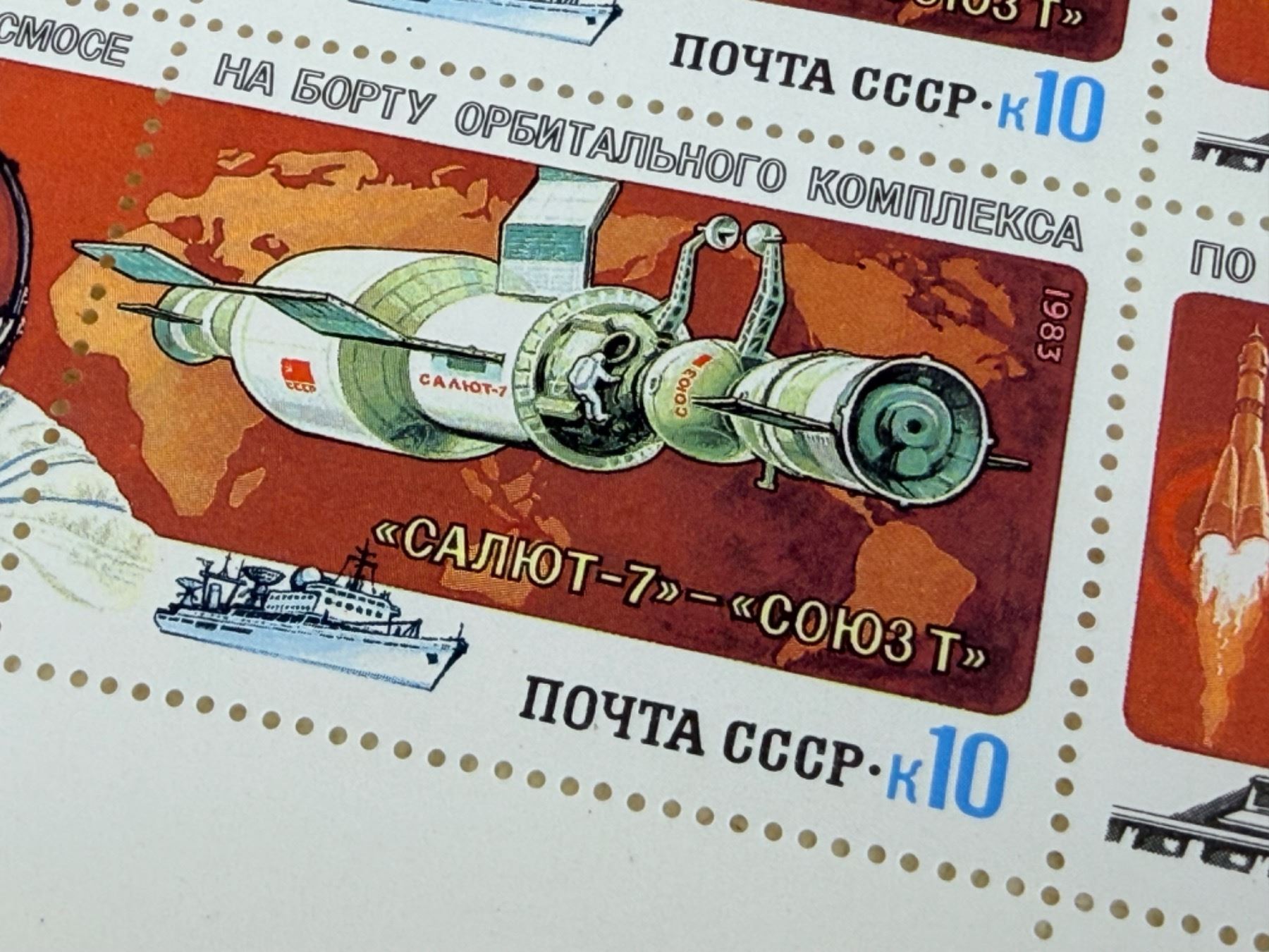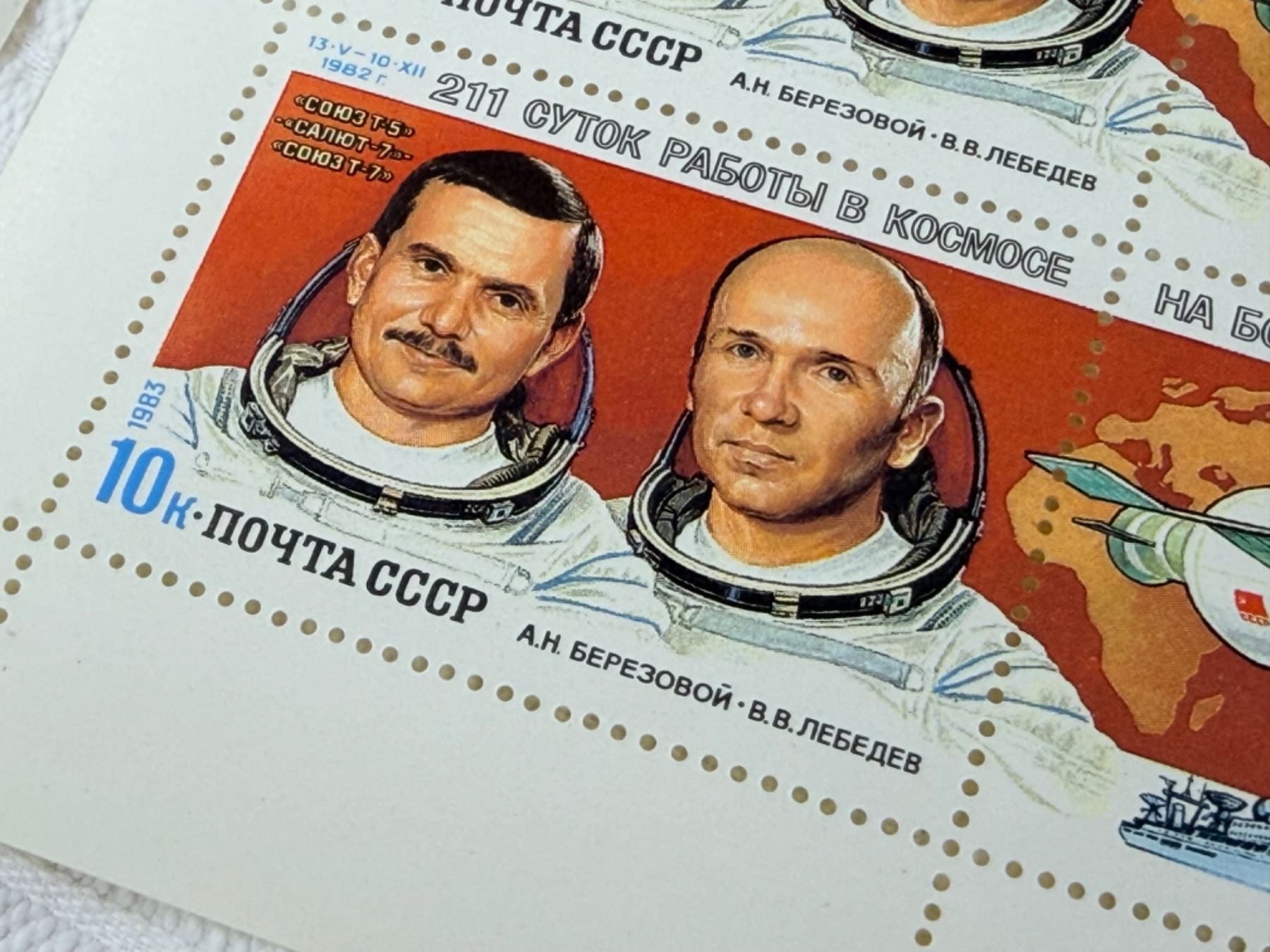 STAMPS WITH PORTRAITS OF COSMONAUTS ALONGSIDE IMAGES OF SPACECRAFT AND ORBITAL MODULES