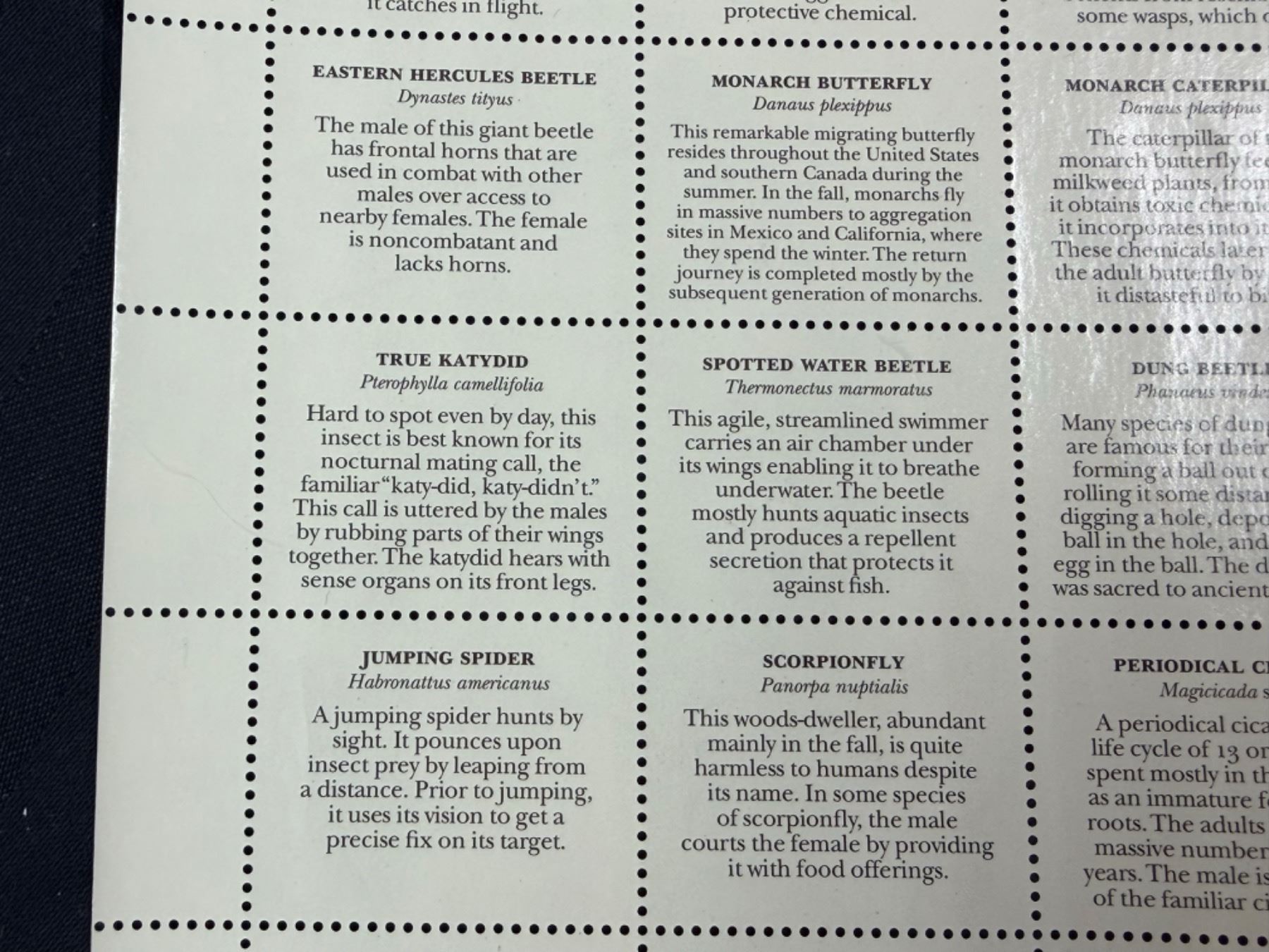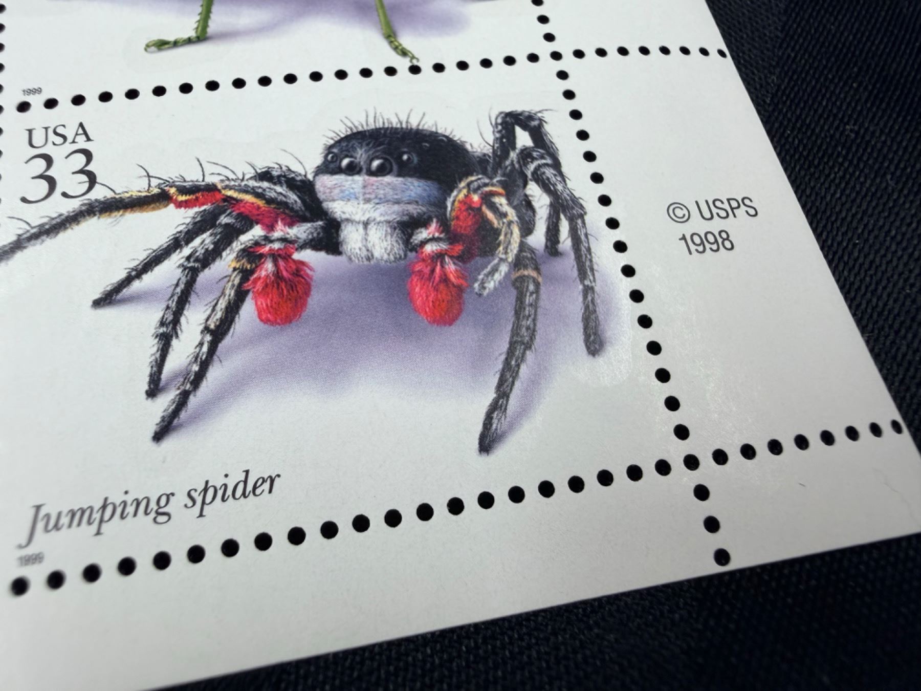 RELEASE DATE: OCTOBER 1, 1999; CATALOG NUMBER: SCOTT #335; PRINTING FEATURE: THESE STAMPS ARE KNOWN FOR THEIR UNIQUE PHOSPHORESCENT TAGGING - WHEN EXPOSED TO SHORTWAVE ULTRAVIOLET LIGHT, THE CREATURES ON THE STAMPS TAKE ON A UNIQUE GLOW; CRITTERS: BLACK WIDOW, SPINYBACKED SPIDER, JUMPING SPIDER, YELLOW GARDEN SPIDER, MONARCH BUTTERFLY, LADY BEETLE (LADYBUG), HERCULES BEETLE, KATYDID, EBONY JEWELWING, SCORPIONFLY, AND DOGBANE BEETLE