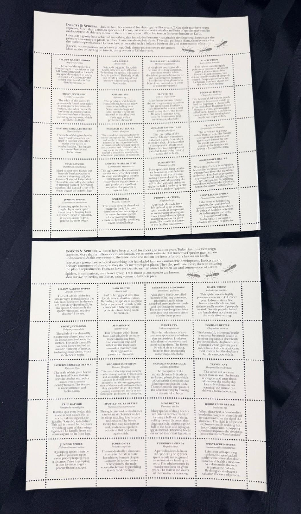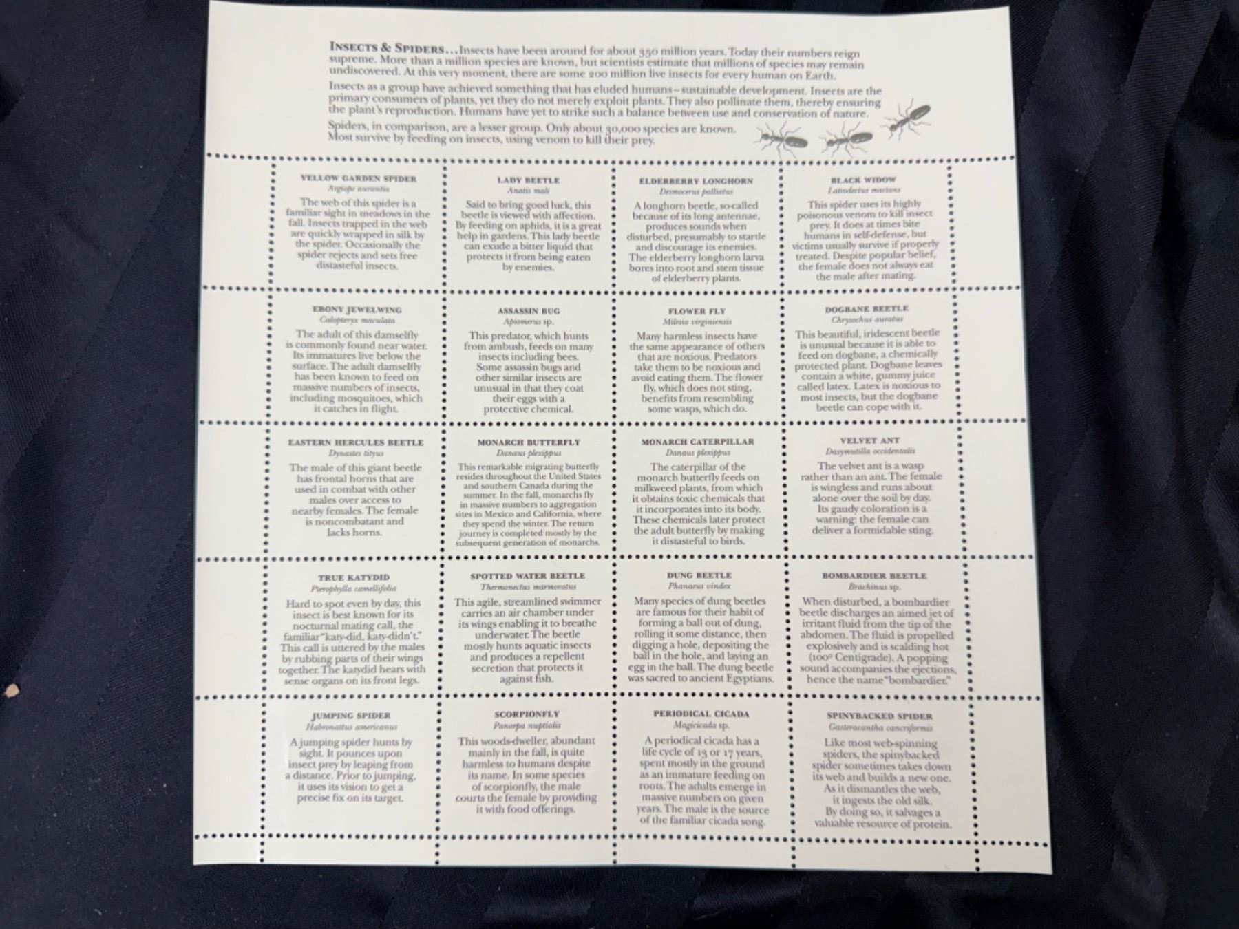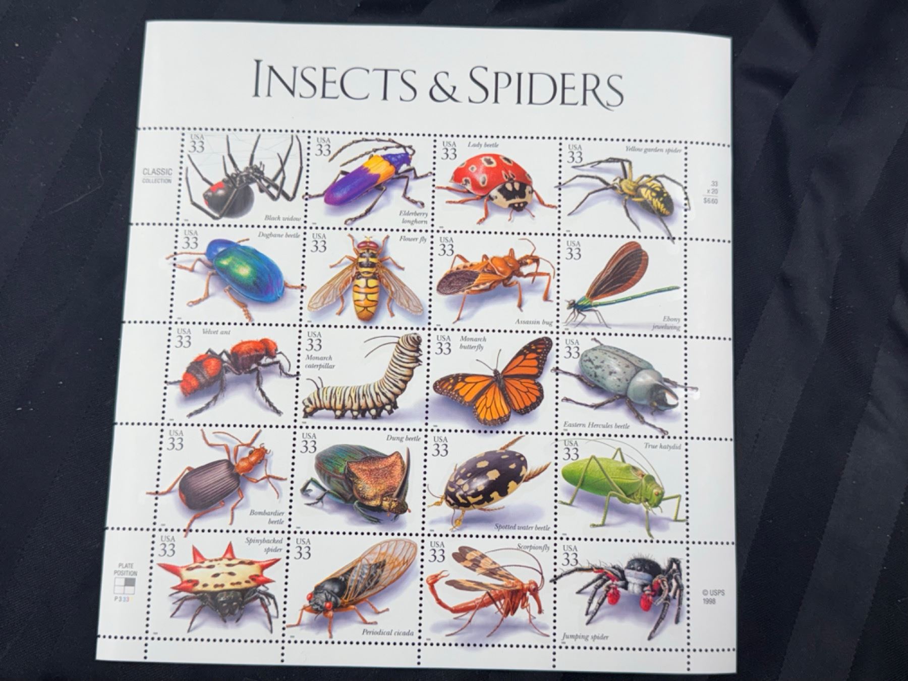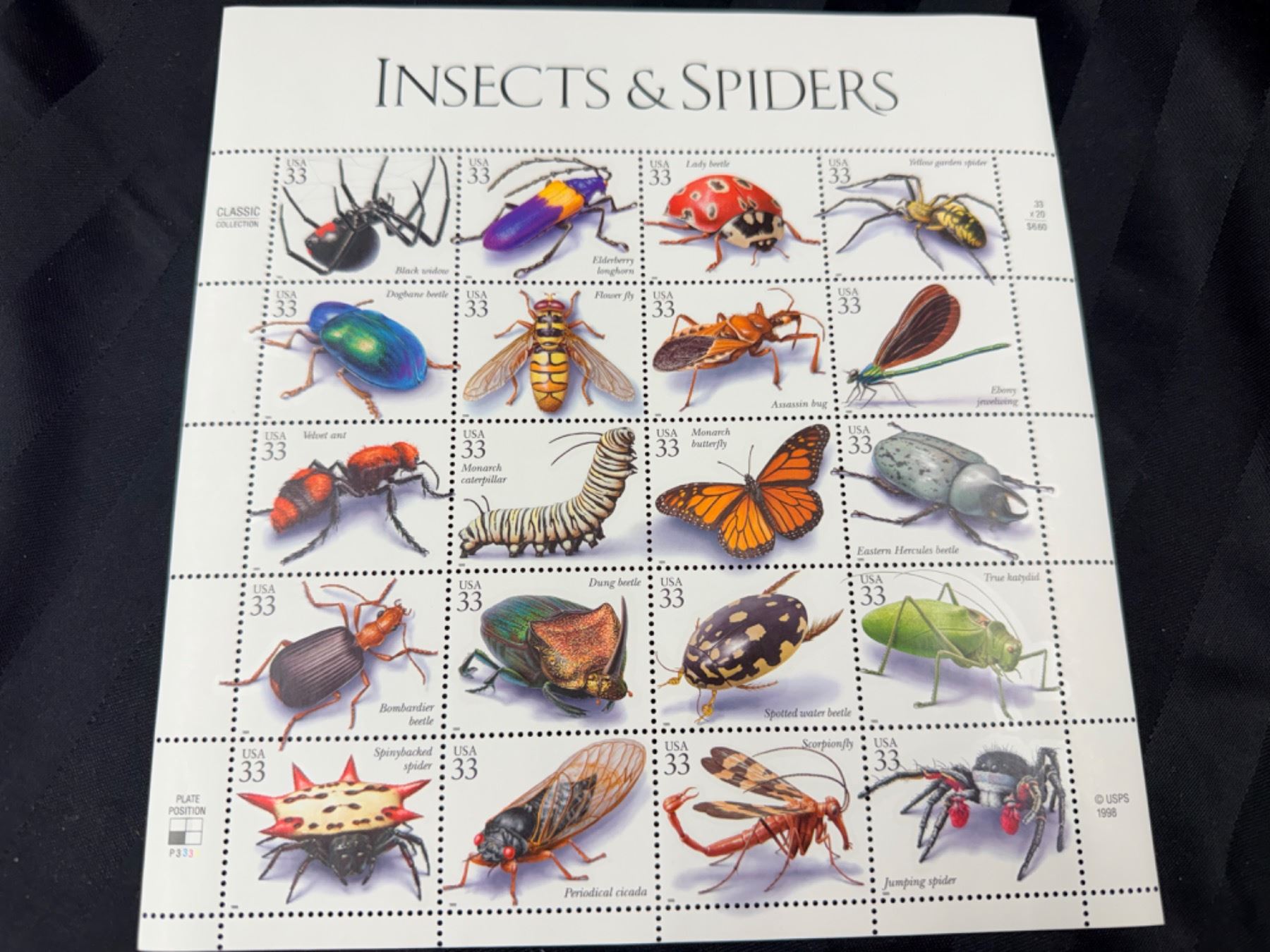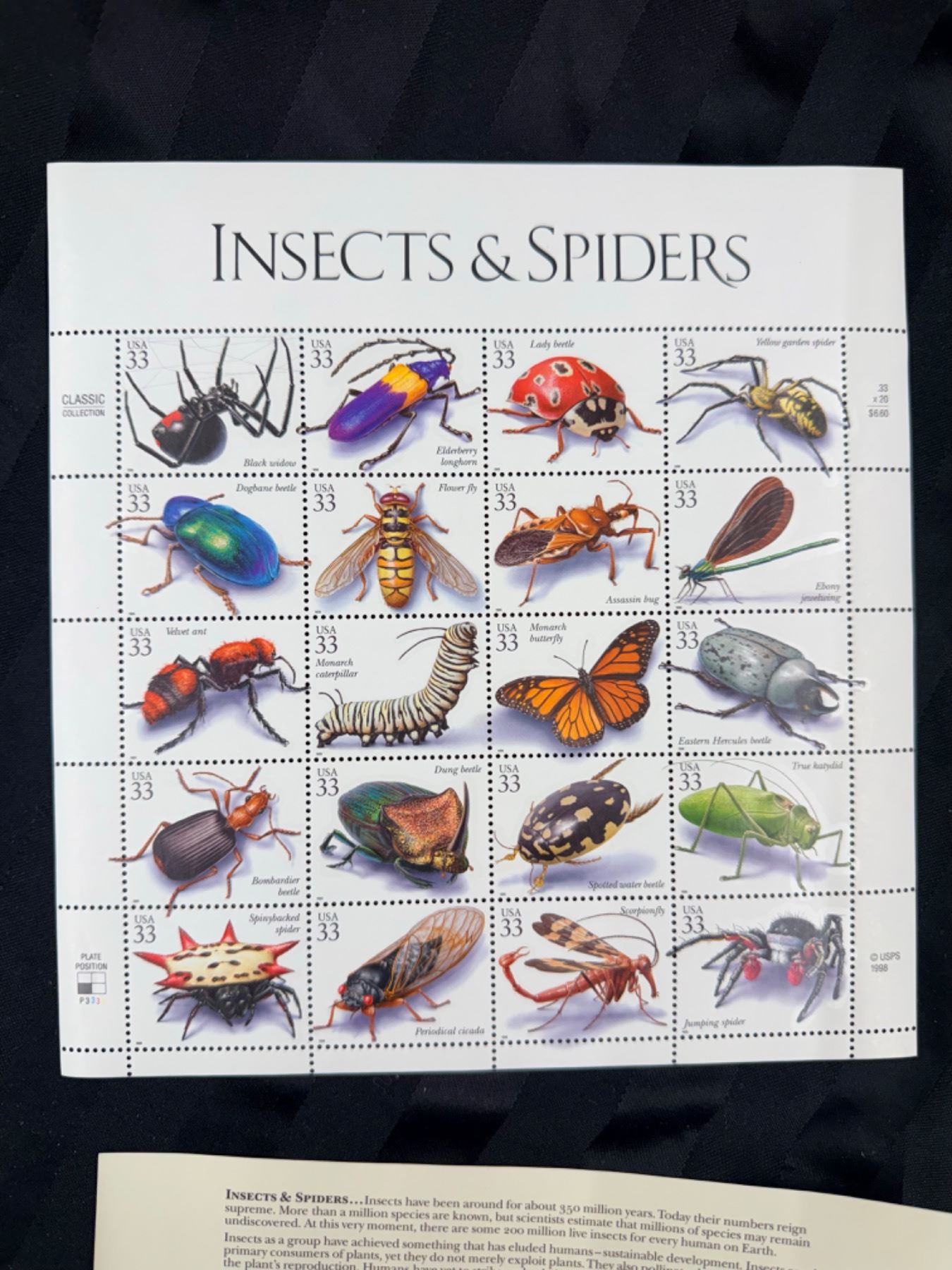 PART OF NATIONAL STAMP COLLECTING MONTH. EACH SHEET CONTAINS 20 DIFFERENT 33-CENT STAMPS FEATURING 16 INSECTS AND 4 SPIDERS, CHOSEN FOR THEIR EDUCATIONAL VALUE AND INTEREST TO CHILDREN