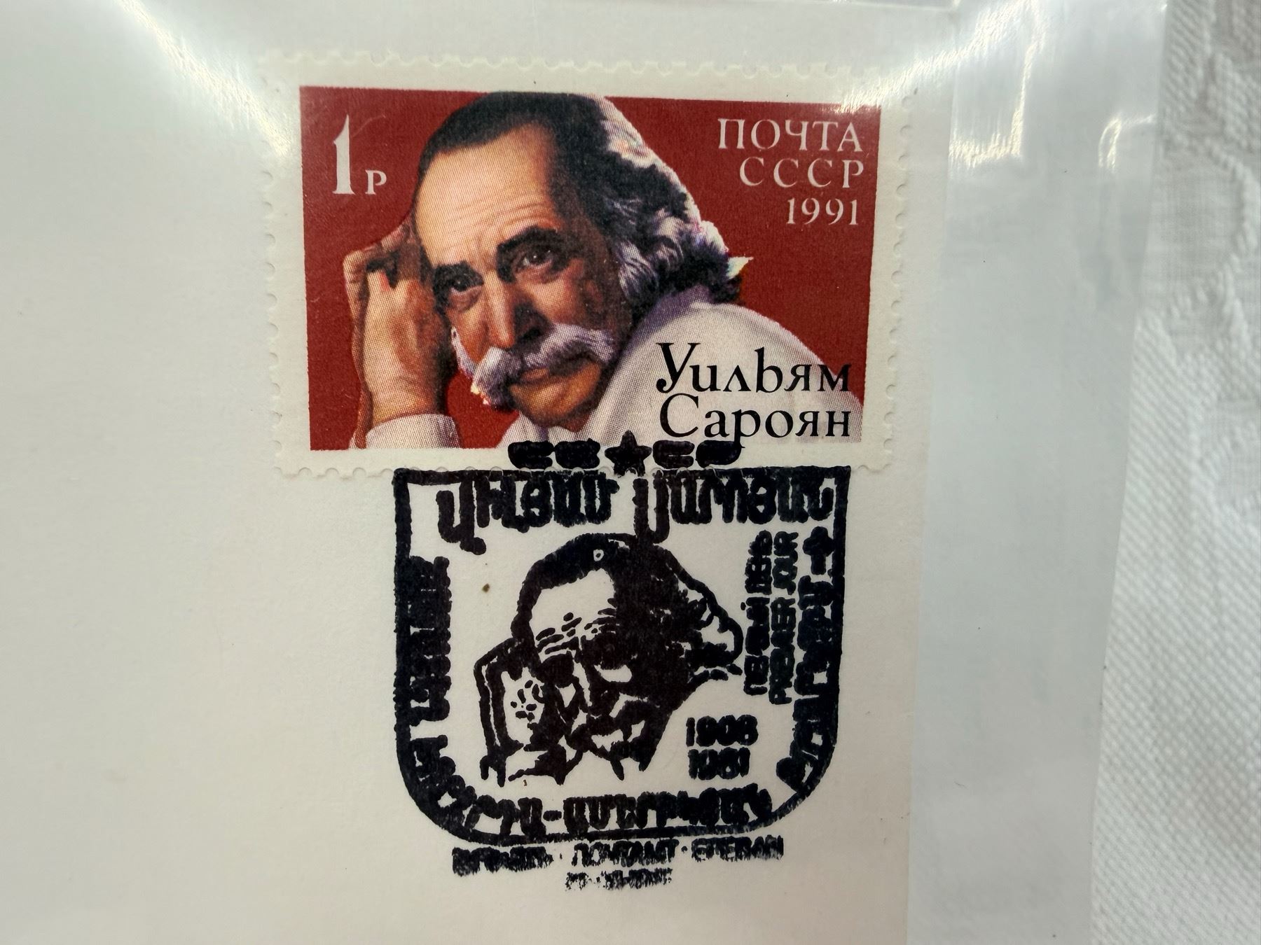 THE ENVELOPE FEATURES A "SILK CACHET" ILLUSTRATION OF SAROYAN AND IS POSTMARKED WITH A SPECIAL "FIRST DAY OF ISSUE" CANCELLATION /// THE SHEET CONTAINS 50 UNUSED, MINT CONDITION STAMPS FEATURING A PORTRAIT OF WILLIAM SAROYAN