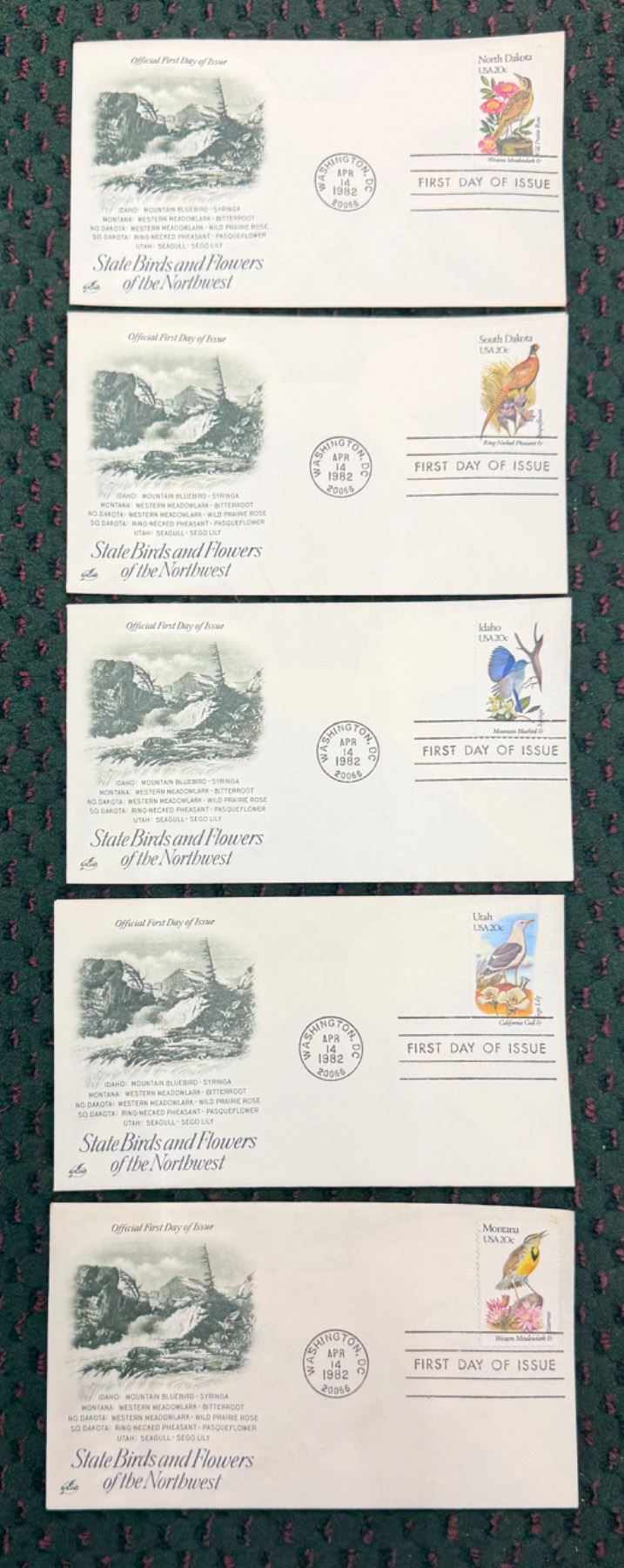 EACH ENVELOPE CONTAINS A FIRST DAY OF ISSUE STAMP THAT HAS THE STATE BIRD AND THE STATE FOR ITS RESPECTIVE STATE; THE SET IS DIVIDED INTO REGIONS OF THE UNITED STATES; FIRST DAY OF ISSUE: APRIL 14, 1982 POSTMARKED WASHINGTON, D.C.; WHAT A GREAT GIFT FOR THE BIRD OR FLOWER ENTHUSIAST OR FOR ANYONE BORN IN 1982!