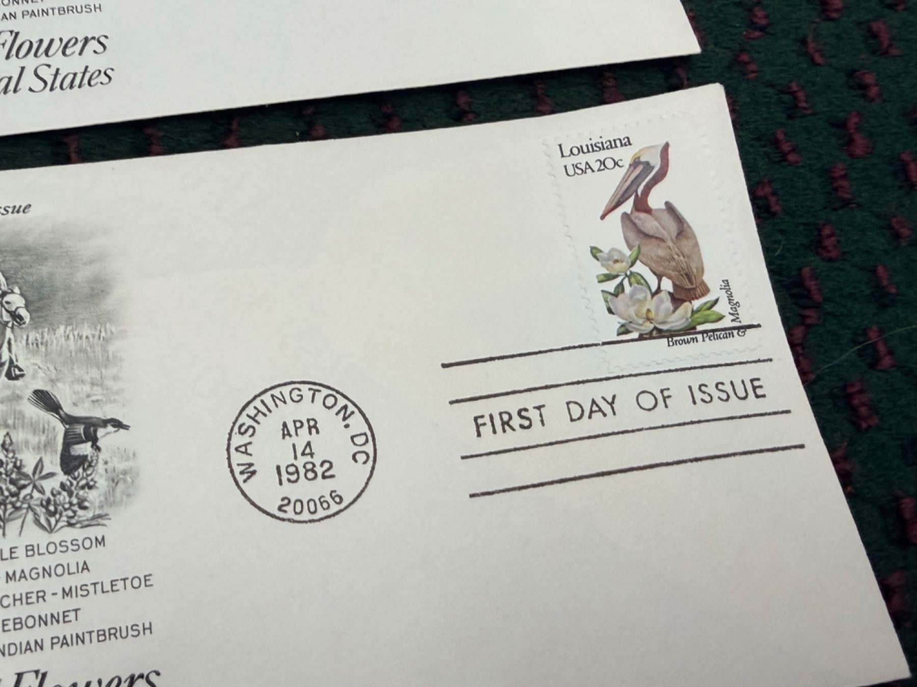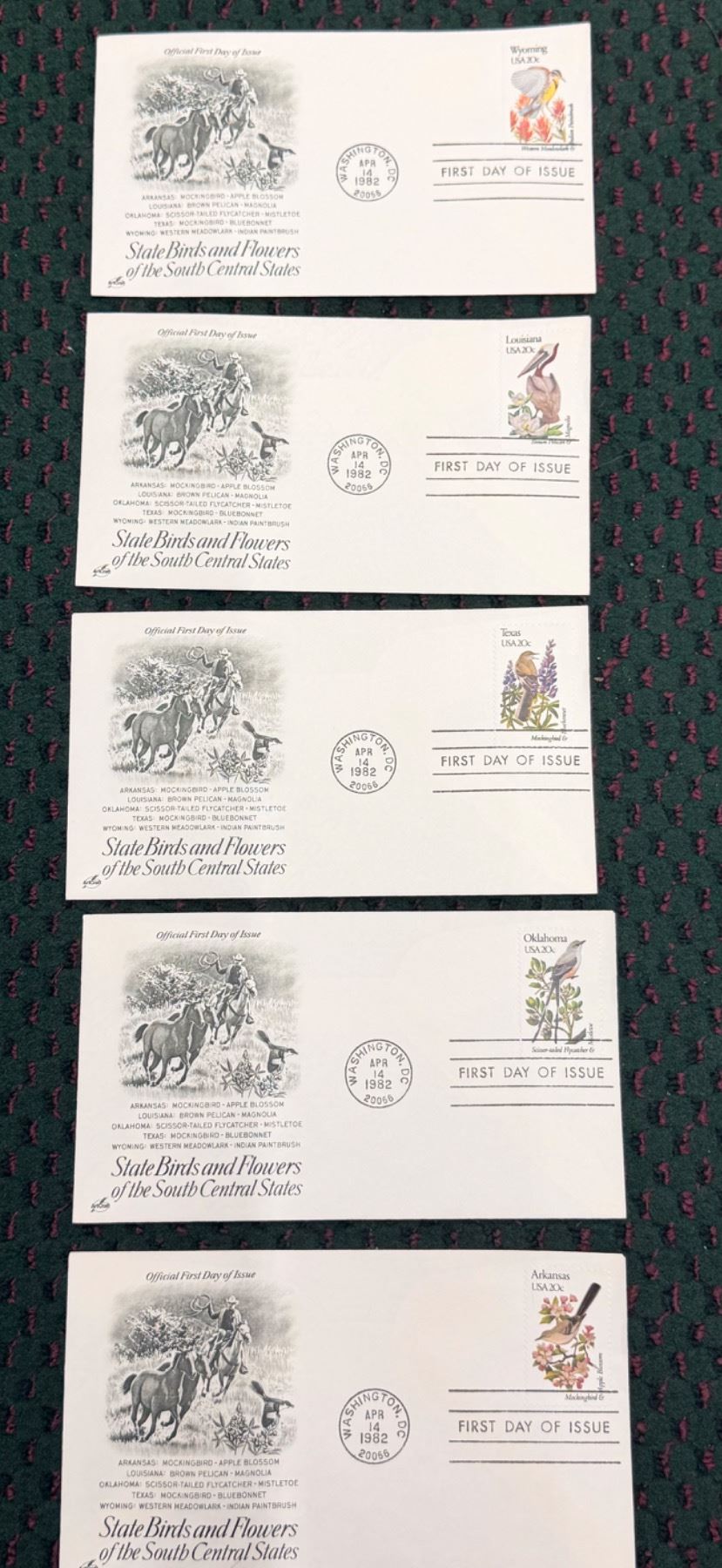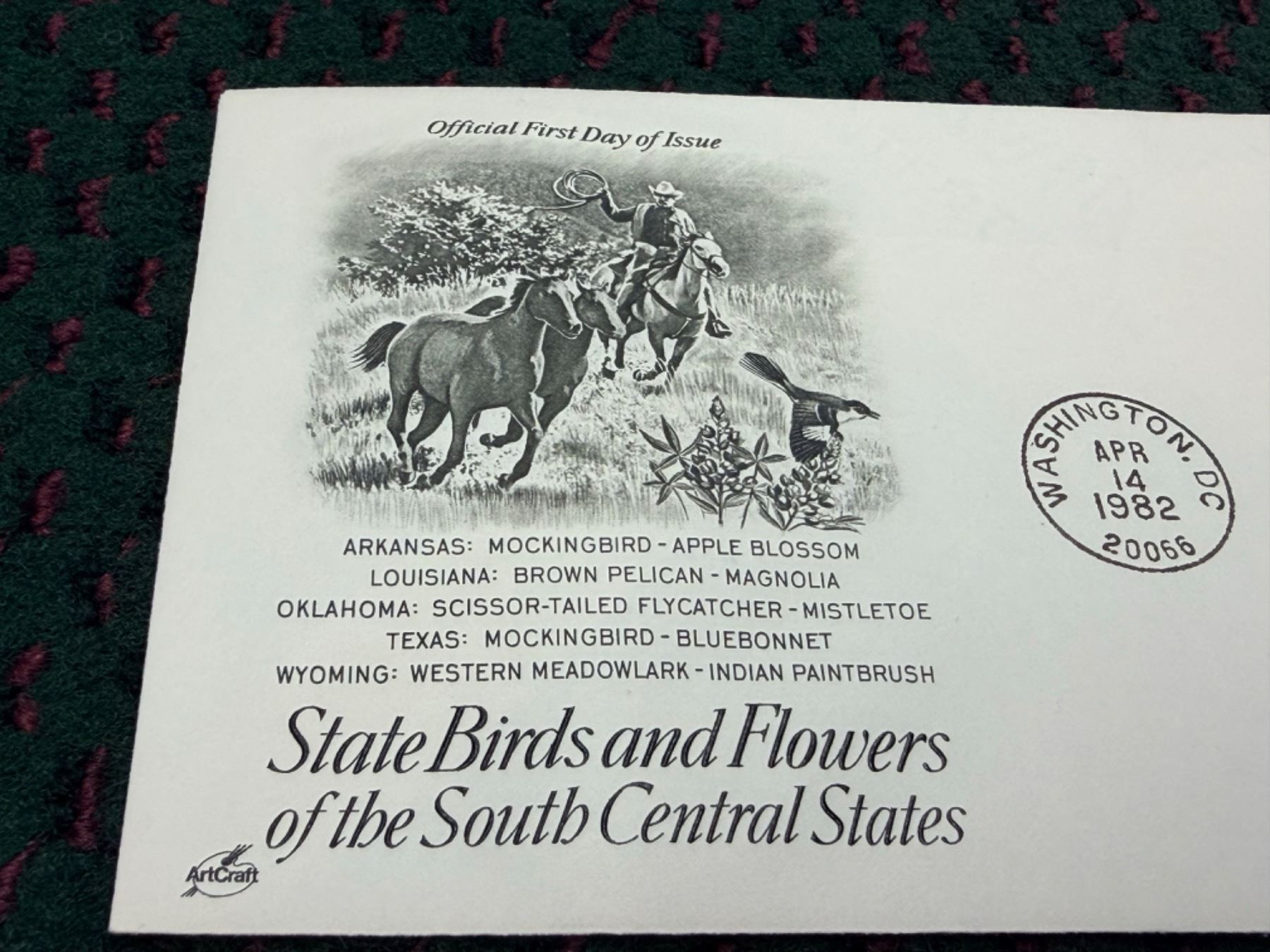 EACH ENVELOPE CONTAINS A FIRST DAY OF ISSUE STAMP THAT HAS THE STATE BIRD AND THE STATE FOR ITS RESPECTIVE STATE; THE SET IS DIVIDED INTO REGIONS OF THE UNITED STATES; FIRST DAY OF ISSUE: APRIL 14, 1982 POSTMARKED WASHINGTON, D.C.; WHAT A GREAT GIFT FOR THE BIRD OR FLOWER ENTHUSIAST OR FOR ANYONE BORN IN 1982!