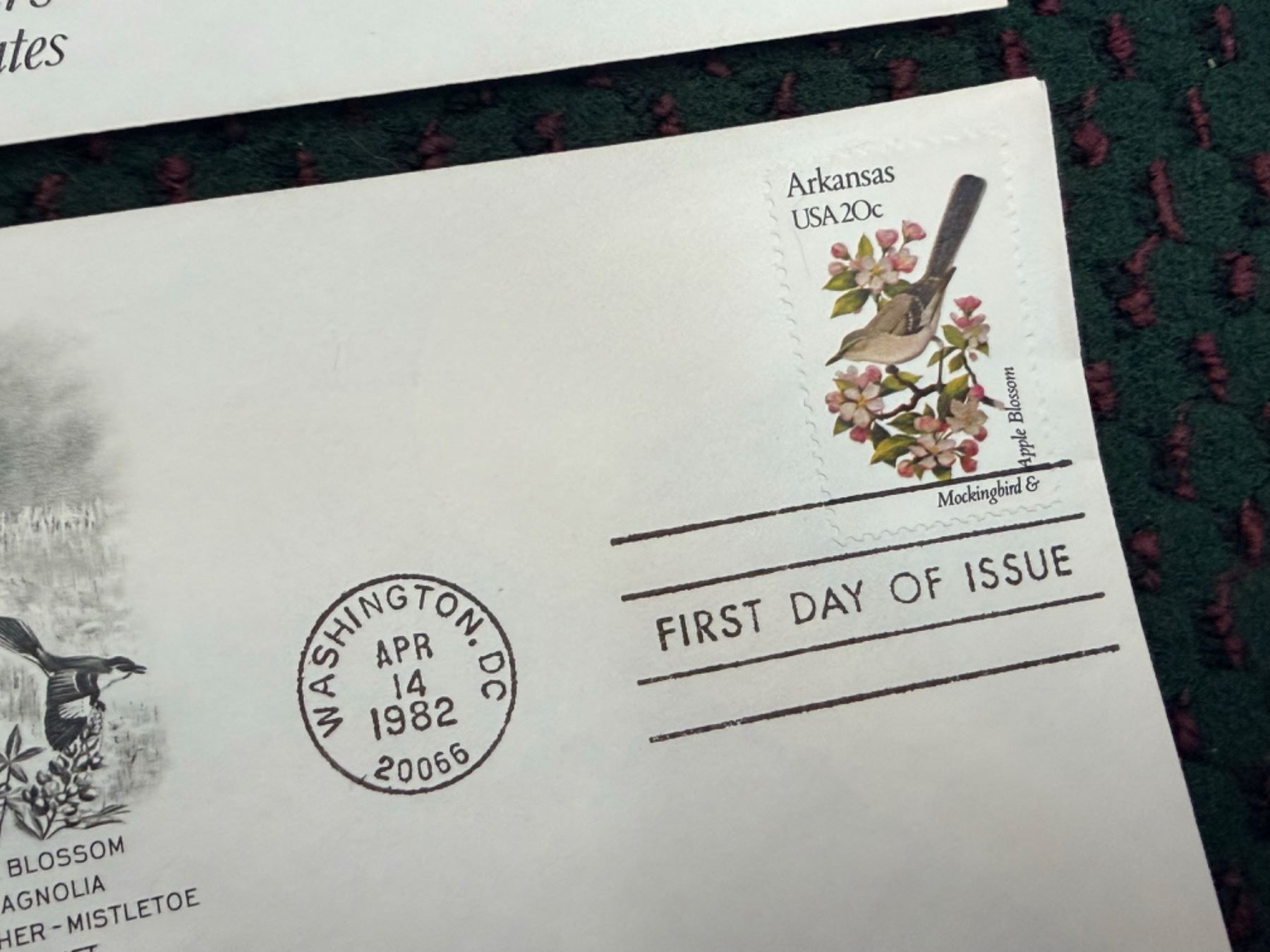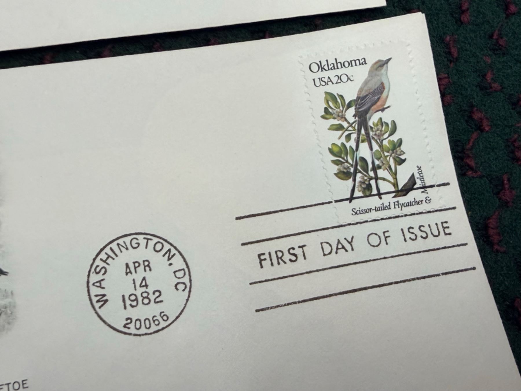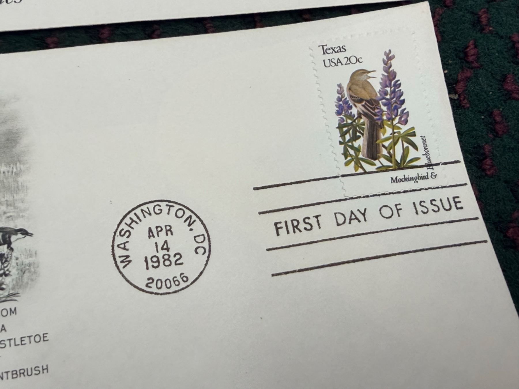 EACH ENVELOPE CONTAINS A FIRST DAY OF ISSUE STAMP THAT HAS THE STATE BIRD AND THE STATE FOR ITS RESPECTIVE STATE; THE SET IS DIVIDED INTO REGIONS OF THE UNITED STATES; FIRST DAY OF ISSUE: APRIL 14, 1982 POSTMARKED WASHINGTON, D.C.; WHAT A GREAT GIFT FOR THE BIRD OR FLOWER ENTHUSIAST OR FOR ANYONE BORN IN 1982!