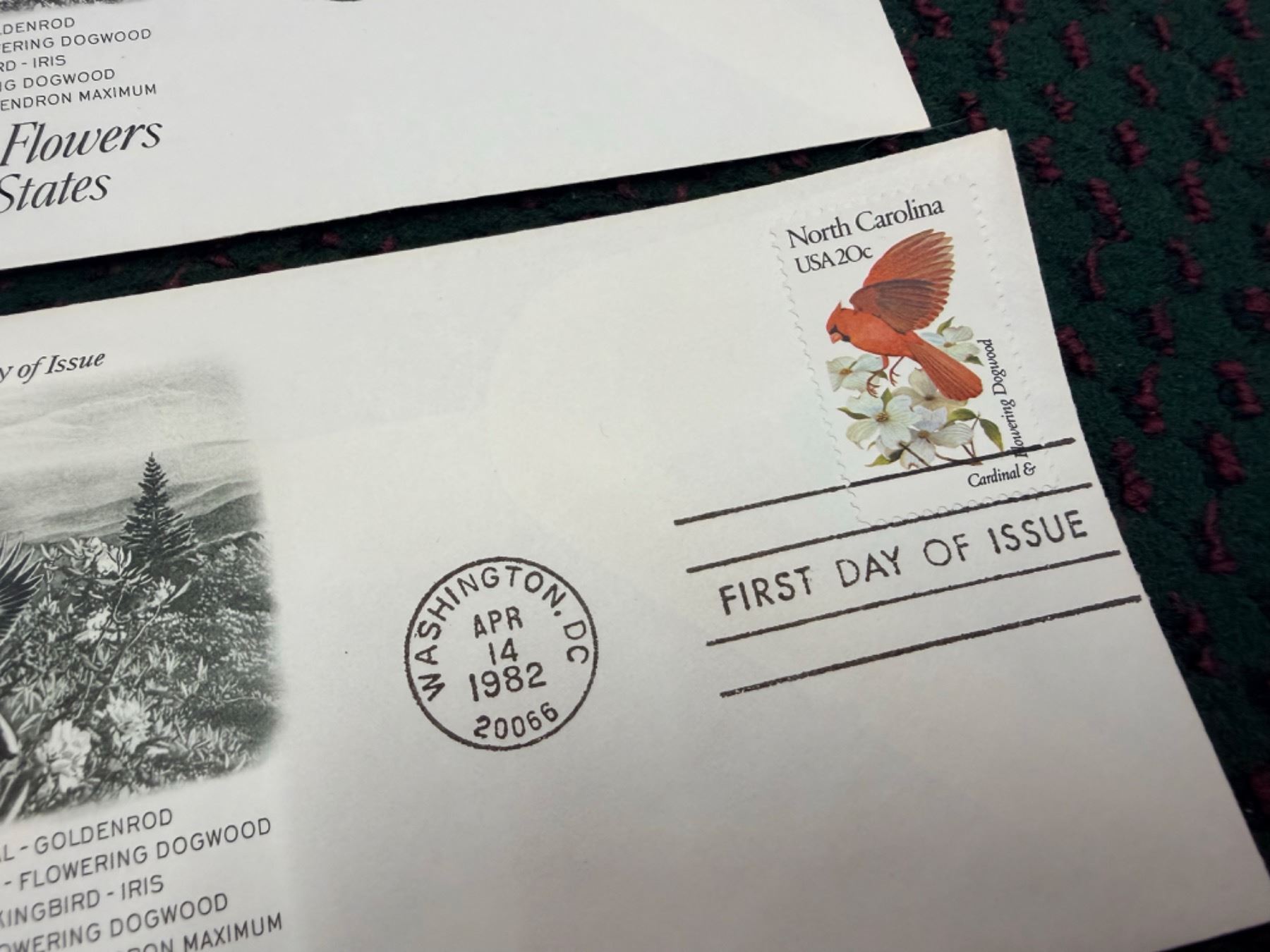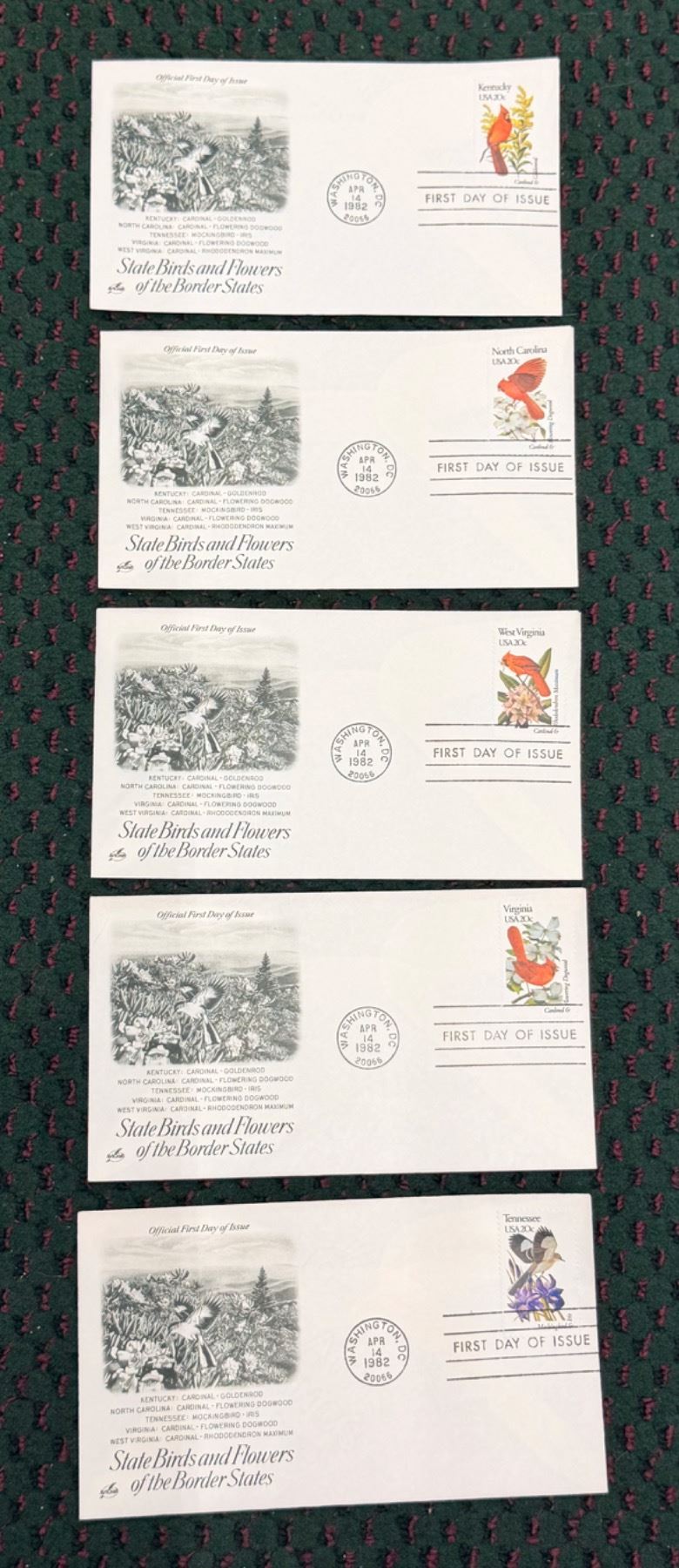 EACH ENVELOPE CONTAINS A FIRST DAY OF ISSUE STAMP THAT HAS THE STATE BIRD AND THE STATE FOR ITS RESPECTIVE STATE; THE SET IS DIVIDED INTO REGIONS OF THE UNITED STATES; FIRST DAY OF ISSUE: APRIL 14, 1982 POSTMARKED WASHINGTON, D.C.; WHAT A GREAT GIFT FOR THE BIRD OR FLOWER ENTHUSIAST OR FOR ANYONE BORN IN 1982!