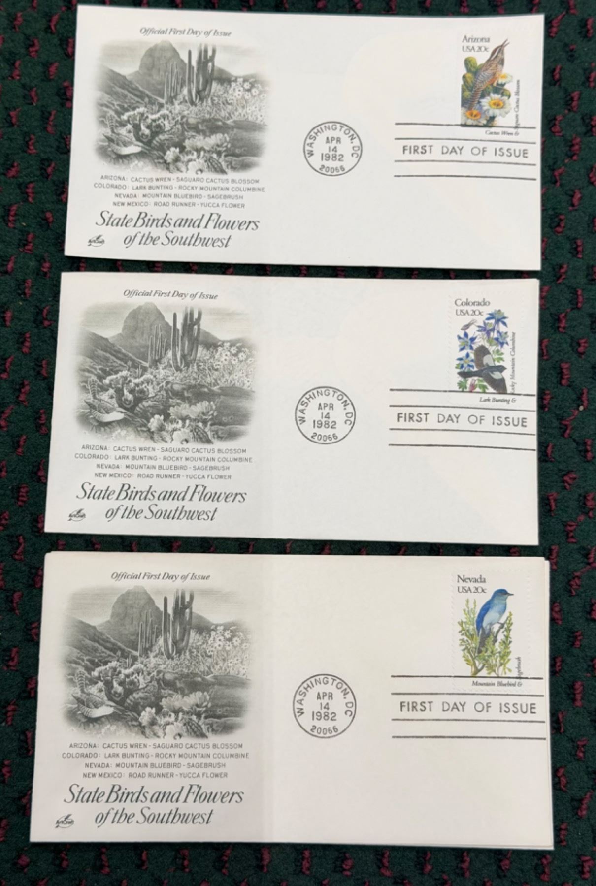 EACH ENVELOPE CONTAINS A FIRST DAY OF ISSUE STAMP THAT HAS THE STATE BIRD AND THE STATE FOR ITS RESPECTIVE STATE; THE SET IS DIVIDED INTO REGIONS OF THE UNITED STATES; FIRST DAY OF ISSUE: APRIL 14, 1982 POSTMARKED WASHINGTON, D.C.; WHAT A GREAT GIFT FOR THE BIRD OR FLOWER ENTHUSIAST OR FOR ANYONE BORN IN 1982!