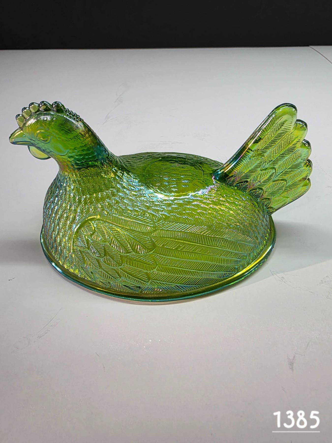 Lot 1385 Green carnival glass hen top- 6" by 4"