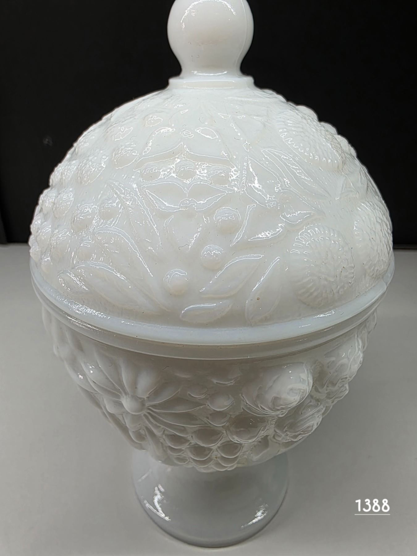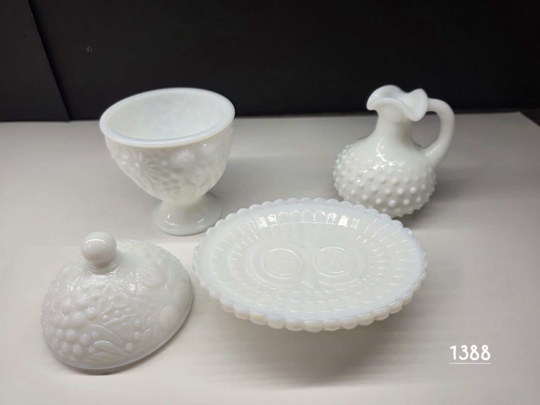 Lot 1388 Avon milk glass collectables, pedestal, soap dish, candy dish, pitcher