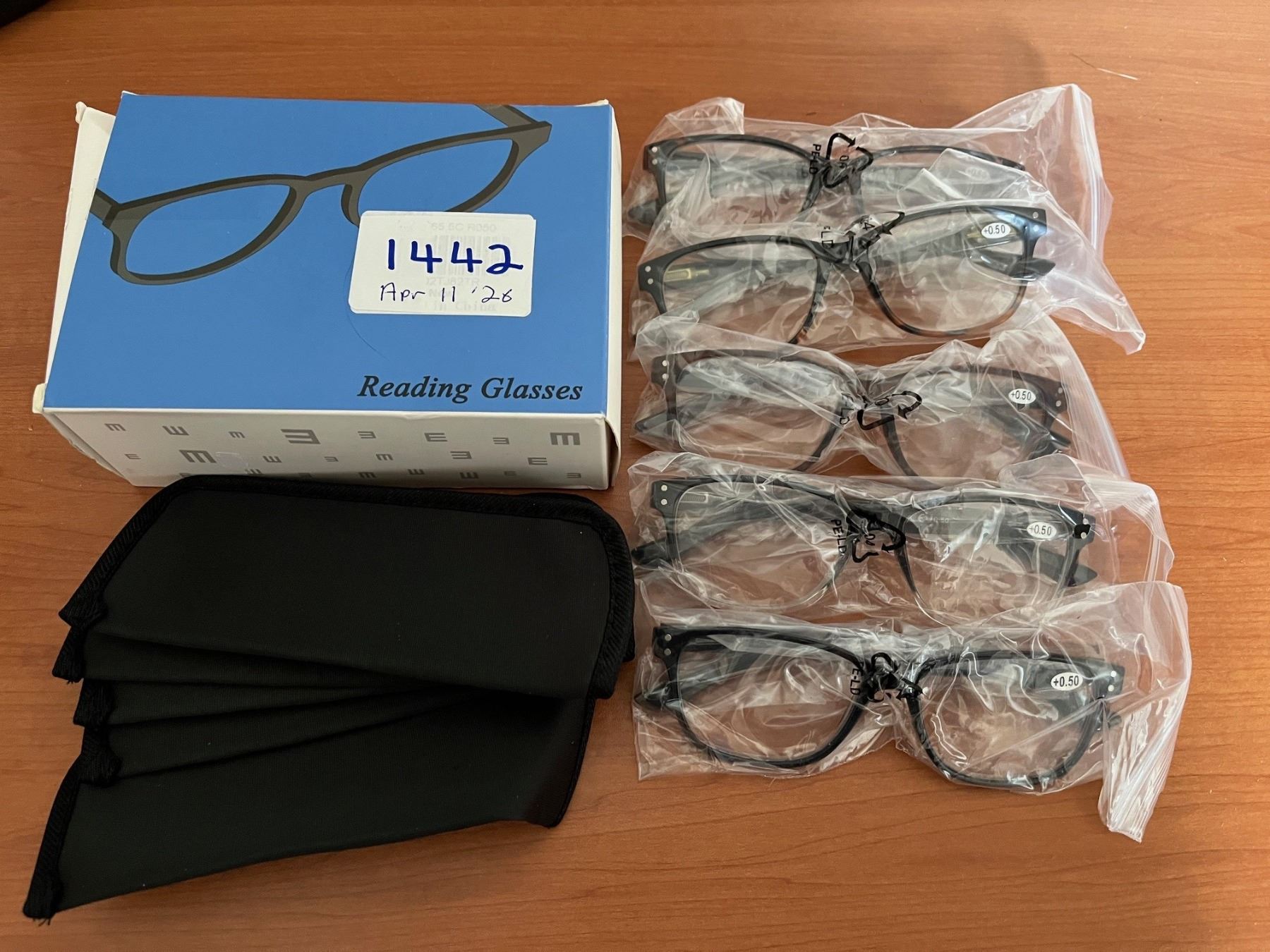 Lot 1442 Reading Glasses x 5. +0.50 strength. New with cases. Never used.