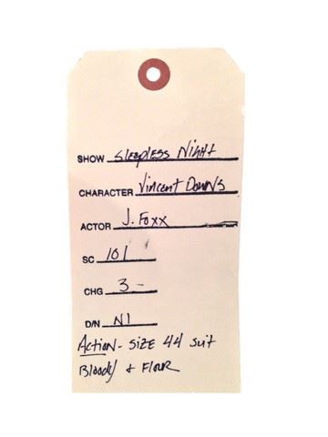 Vincent Downs (Jamie Foxx) screen worn, hero action suit, including 2 piece 'Giorgio Armani' charcoal suit stained with flour from Vincent's fight with McFerrin (Tim Connolly) in the Luxus Casino kitchen, and white 'Boss' long sleeve dress shirt stained with blood from when Vincent was stabbed during the kidnapping of his son Thomas (Octavius J. Johnson) (L). Includes wardrobe tag.