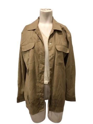 Adaptation. (2002) - Susan Orlean (Meryl Streep) screen worn, tan/khaki colored distressed button up, long sleeve shirt with a creme colored, cropped, Jockey v neck t shirt (s).
