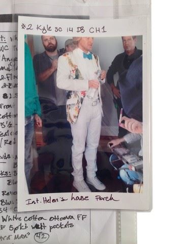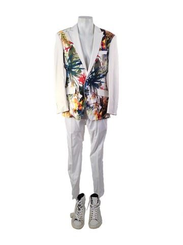 Kyle (Owen Wilson) screen worn, hero, off white "Angelino" suit coat made of artificial leather and is covered in front and back body of the jacket in a bright floral pattern(38), "Zara Man" pants, white, "Kenneth Cole Reaction" shoes white high-tops with white laces blue(11). Worn in the wedding scene. Continuity sheet along with wardrobe tags and wardrobe pictures of Kyle(Owen Wilson).