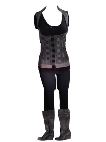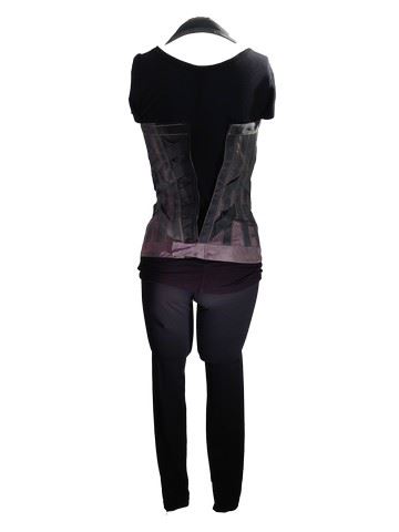 Alice (Milla Jovovich) screen worn, stunt #101, black yoga pants, black tee shirt "T Babaton" and "famous Alice vest" custom made muted silver/grey vest with broken zipper with black "Aldo" wedge boots. This costume is from the opening scene and was also worn in Resident Evil: Afterlife. In that film, this was Alice's main costume, worn throughout the movie and the last costume of this kind known to be available for auction.