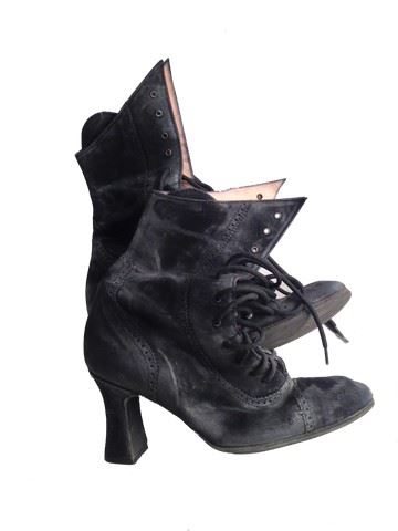 Female Dancer, screen worn, hero, red see through chiffon dress open in the front with black stitching and ties, bottom half of the dress is shredded for a peek-a-boo affect, black and red bodice with attached garters no panties with the bodice, the bodice is sewn onto the chiffon dress, black lace up ankle boots with a heel.
