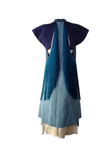Project Runway All Stars, Season 6, Episode 1: "Rookies vs. Veterans" - Garment # 602 - Designer: Fabio ( Veteran). Fabio designed a white gaucho pant ensemble with a 2 toned, blue, capped sleeved vest that has teal fringe in the back flowing from the top to the waist.