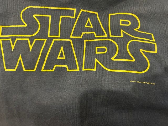 This is a vintage Star Wars T-Shirt from the original 1977 movie. It features a screen printed graphic and is in an unworn condition. The shirt is sized L (38-40), made by Sportique. The design features iconic imagery from the movie and came from someone who worked on the film.