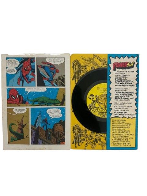 Swing into vintage comic book history with this original 1974 Power Records Book and Record Set featuring Marvel’s legendary wall-crawler, Spider-Man! This collectible set (PR24) includes a beautifully illustrated comic book paired with a dramatic 7" vinyl record that brings the story to life with voice acting, sound effects, and thrilling narration. Official Marvel release from Power Records. Full-color comic book with classic 1970s artwork. 7" vinyl record featuring the story included and in tact.