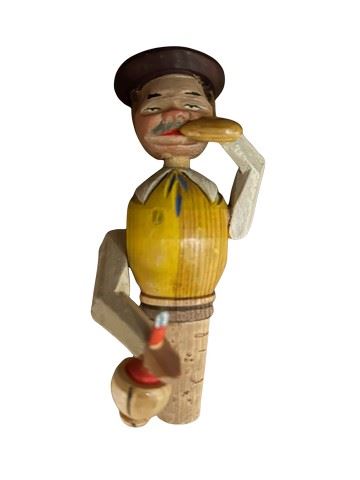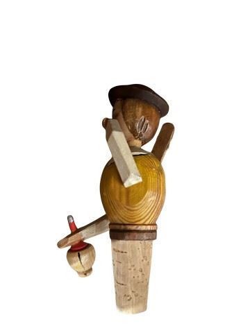 Vintage, hand carved Anri mechanical wine bottle stopper. Made of hand carved and painted wood. This depicts a man who is lifting a bottle to his mouth when the lever in the back is pushed down. Made in Italy by the renowned Anri wood carvers dated to the 1940's-1960s. Designed to fit a standard wine bottle.