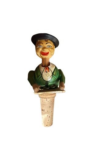 Vintage, hand carved Anri mechanical wine bottle stopper. Made of hand carved and painted wood. This depicts a man who is lifting a pair of spectacles in his hand to his face when the lever in the back is pushed down. Made in Italy by the renowned Anri wood carvers dated to the 1940's-1960s. Designed to fit a standard wine bottle.