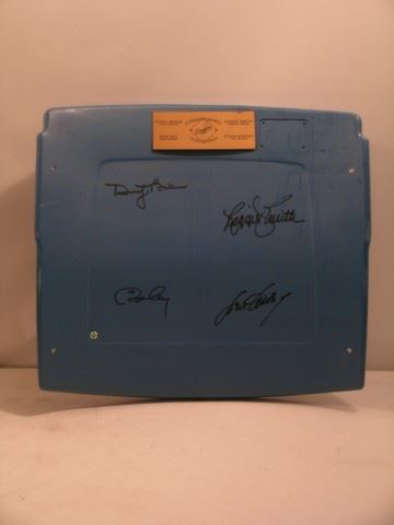 Dodgers Record Setting 30 Homeruns Limited Edition plastic chairback with a plaque on the front and signed by Dusty Baker, Reggie Smith, Ron Cey, and Steve Garvey. Includes the no seat number. Purchased directly from Dodger Stadium and there are no others available like this with the signatures and seat number available for sale. (approx. 19 1/2" x 17)
