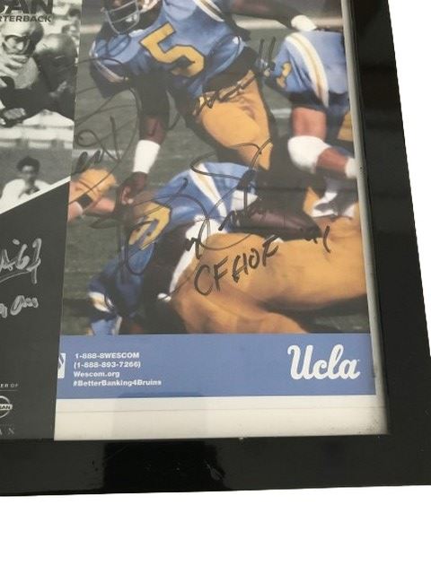 Two posters framed in one frame featuring a black and white photo of Gary Beban the quarterback of UCLA‘s football team who won the Heisman in 1967. Additionally features a color photo of UCLA 1991 Hall of Fame center forward football player #5.