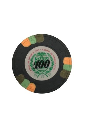 James Bond License to Kill - Screen used "100 "Poker Chip from Casino De Isthmus City. Hand painted on the edges in orange, light green and gold around the edge (1.5" diameter).