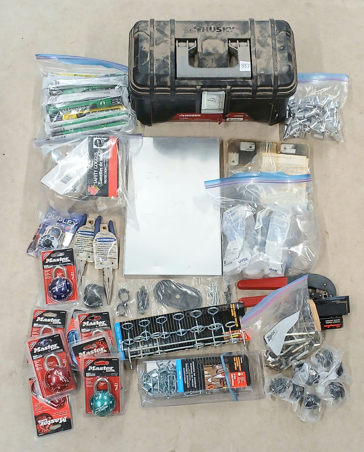 Lot 337 JOB LOT - MASTERLOCKS, SAFETY GLASSES, MISC SOCKETS, HUSKY TOOL CHEST, HAND TOOLS, ETC