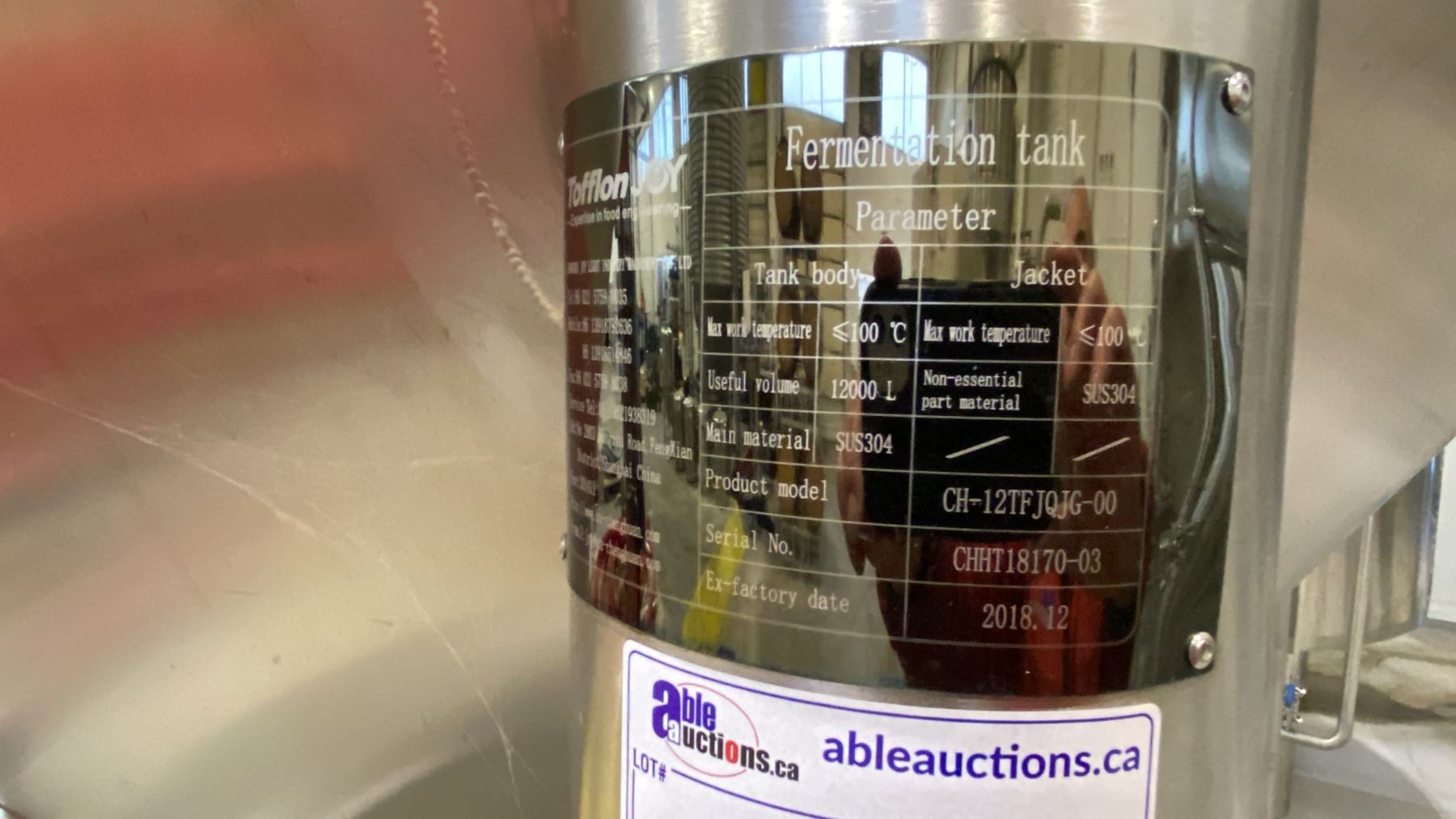Lot 64 CHENGUAN INDUSTRY 12,000-LITER STAINLESS STEEL FERMENTATION TANK UNDER TOFFLON JOY