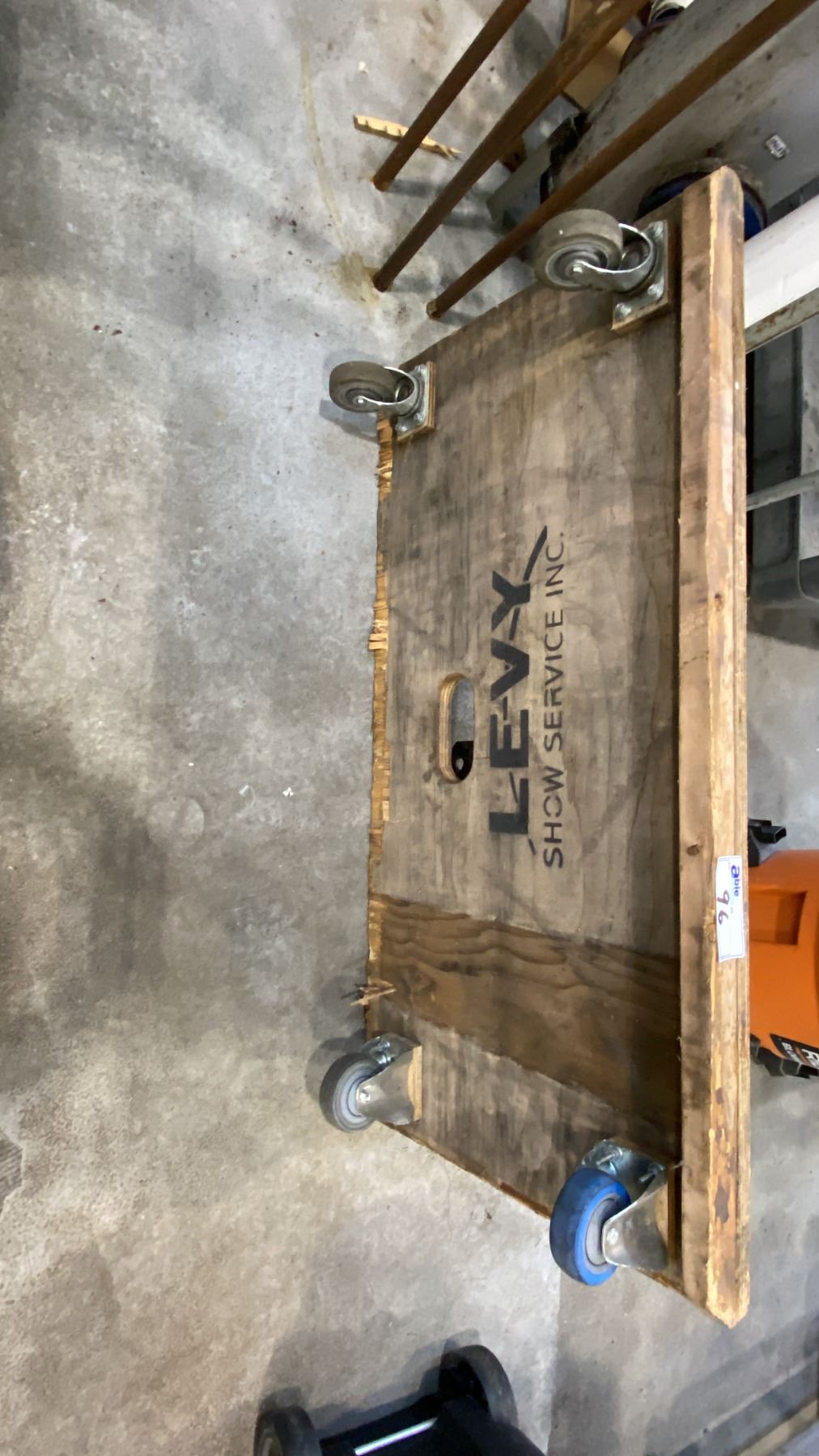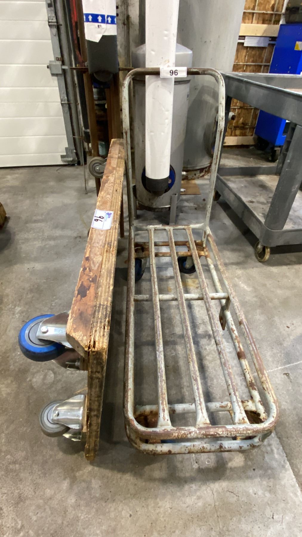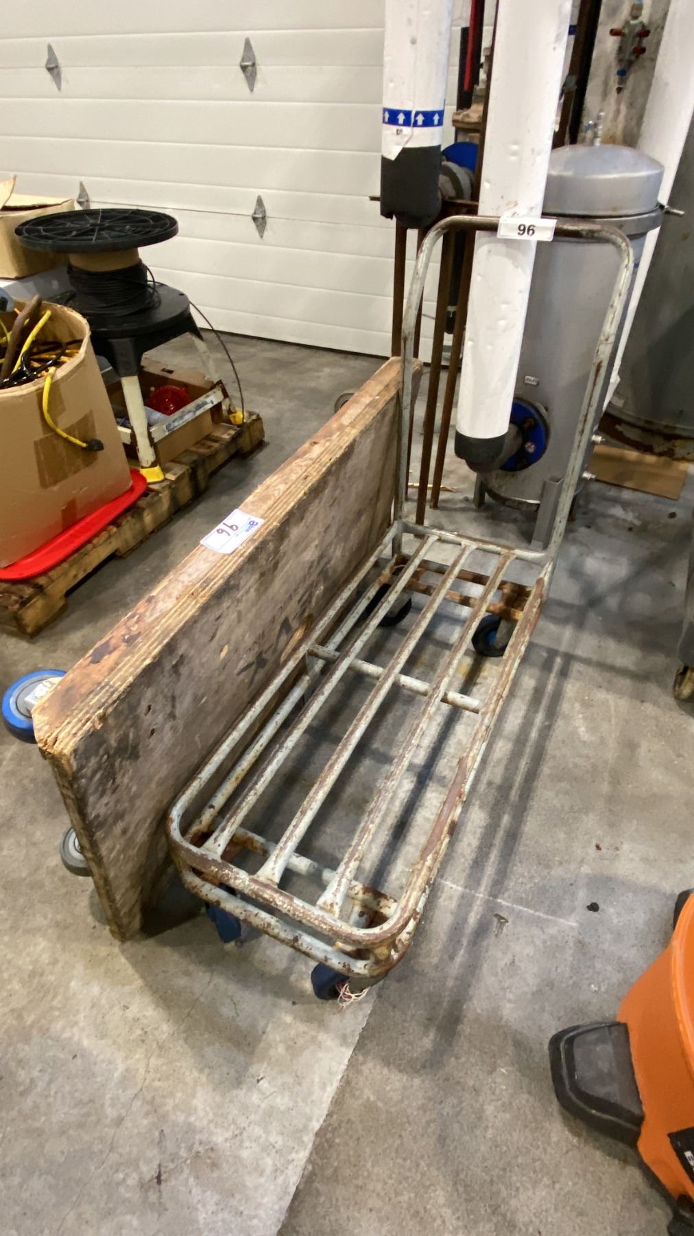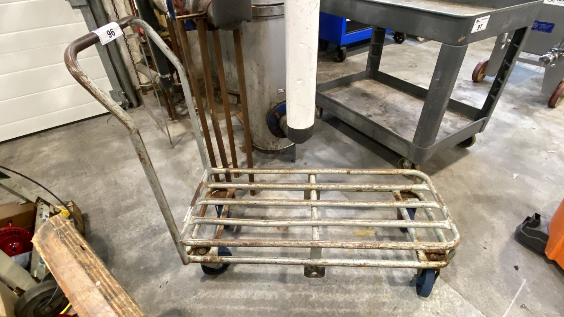 Lot 96 GREY METAL 4 WHEEL MATERIAL CART AND WOODEN 4 WHEEL PLATFORM DOLLY