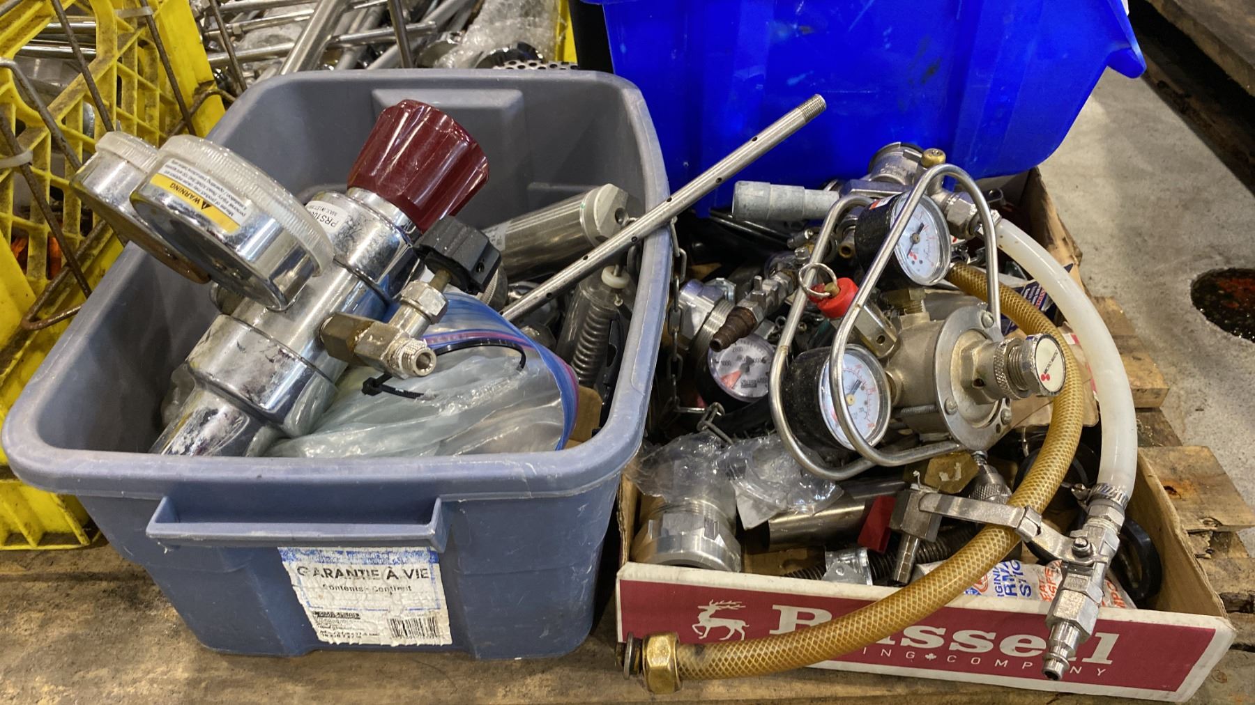 Lot 133 PALLET OF ASSORTED BREW EQUIPMENT INCL GAUGES, CLAMPS, STANDS, ATTACHMENTS AND MORE