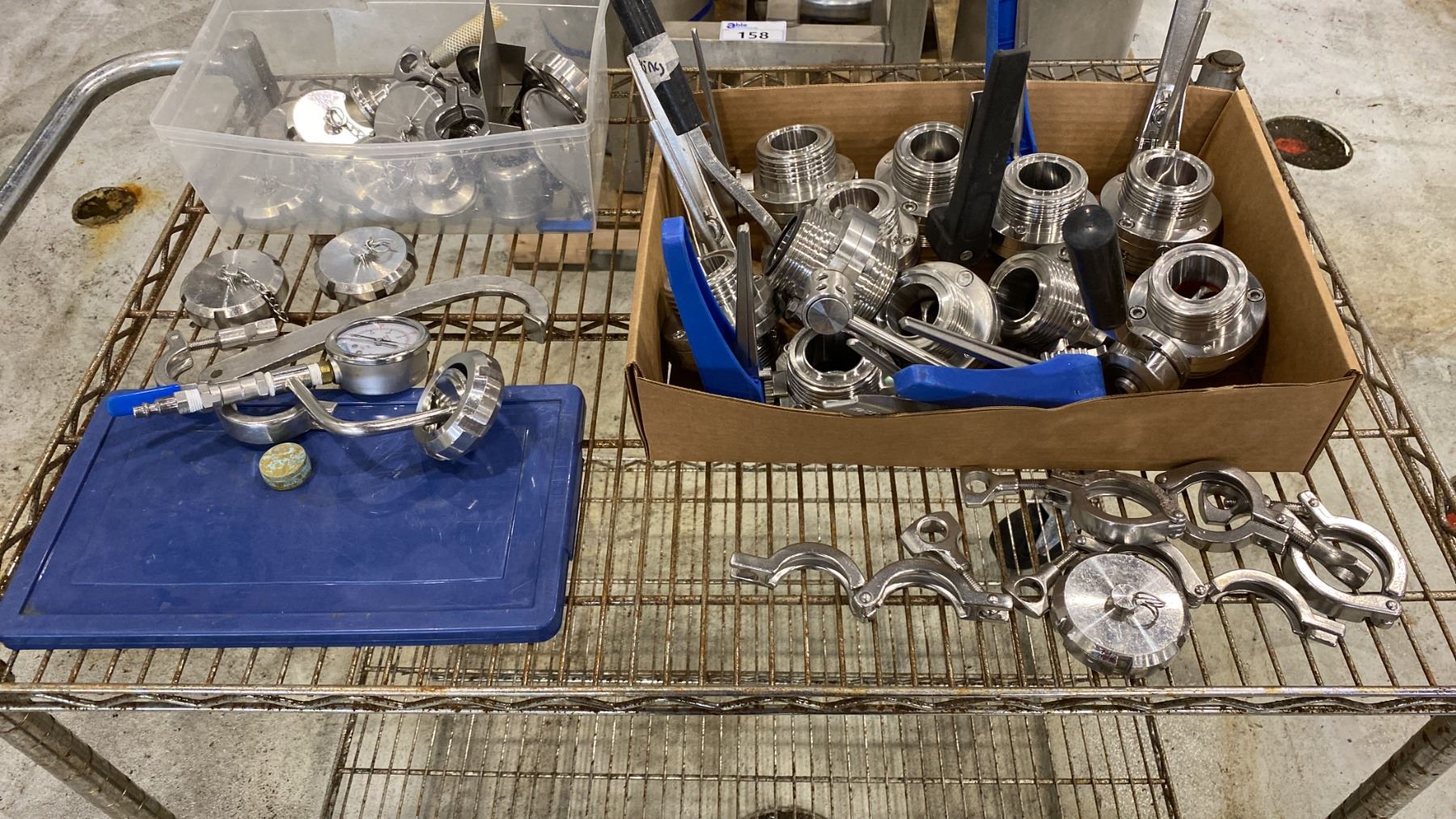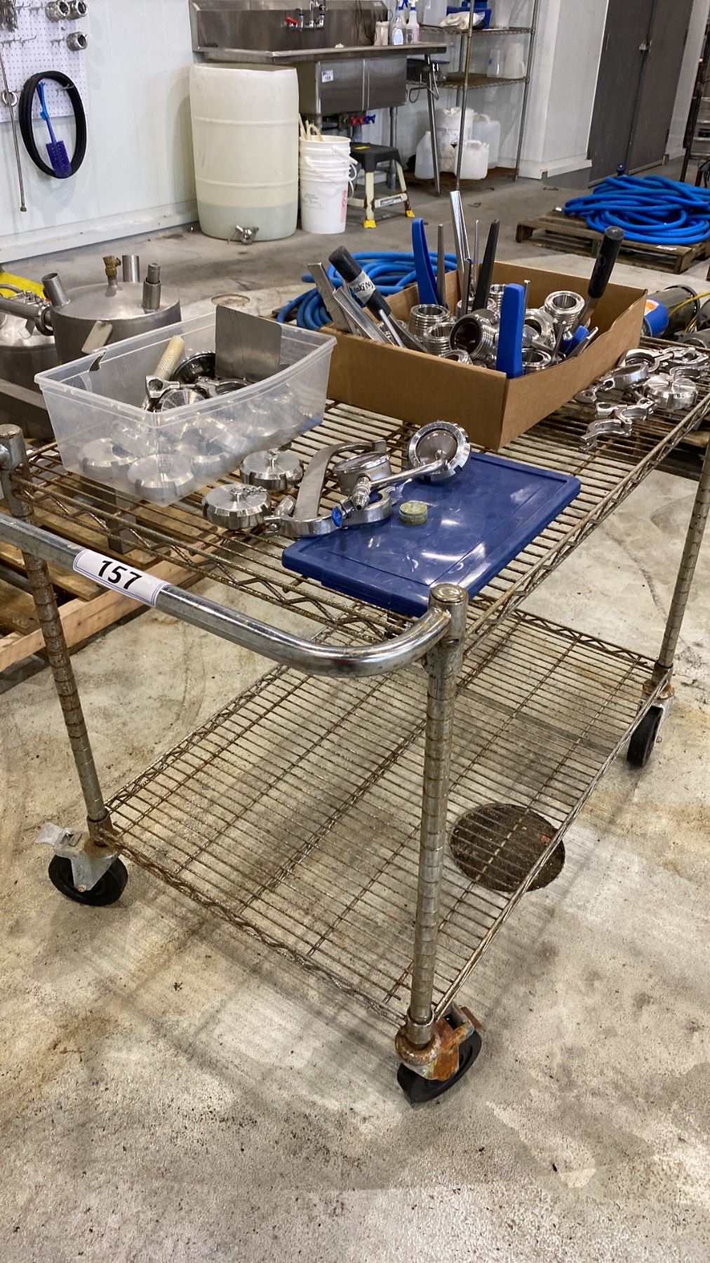 Lot 157 2-TIER UTILITY WIRE CART INCLUDES SANITARY BUTTERFLY VALVES, TRI-CLAMP FITTINGS AND MORE