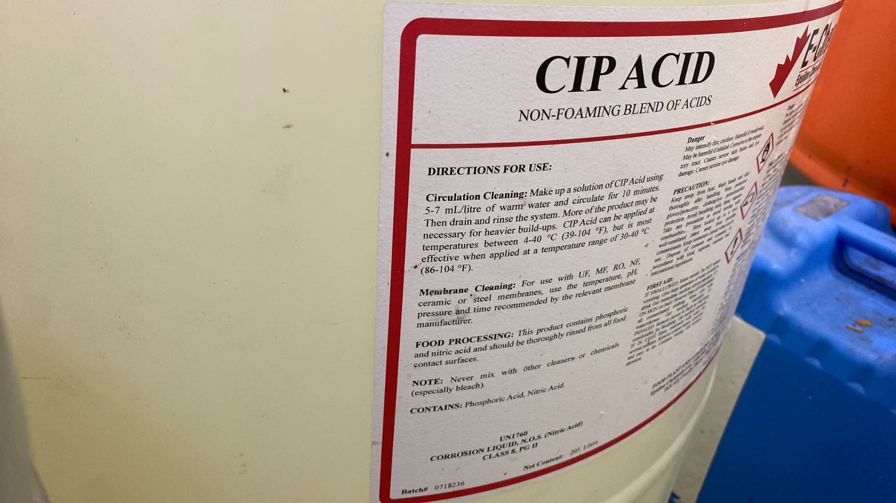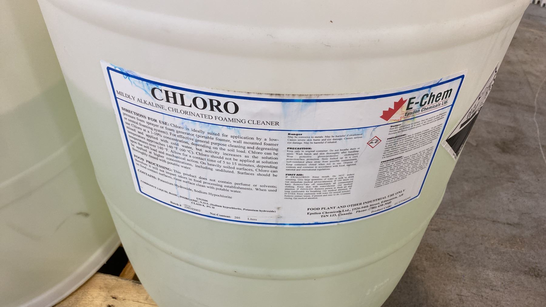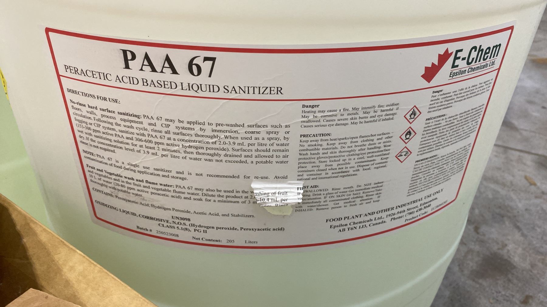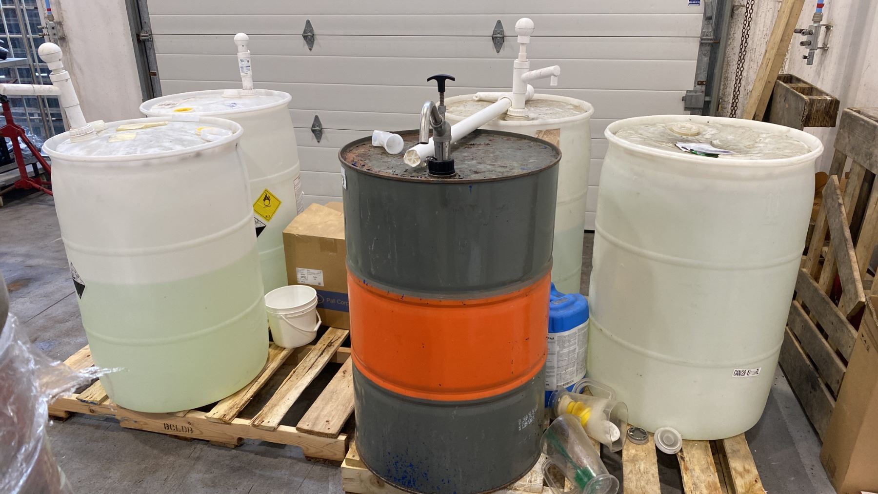 GROUP OF (5) BARRELS OF ASSORTED LIQUID CHEMICAL COMPOUNDS (VARIOUS AMOUNTS LEFT) - CHLORINATED FOAMING CLEANER, PERACETIC ACID BASED LIQUID SANITIZER, (2) NON-FOAMING BLENDS OF ACID AND ISOPROPANOL