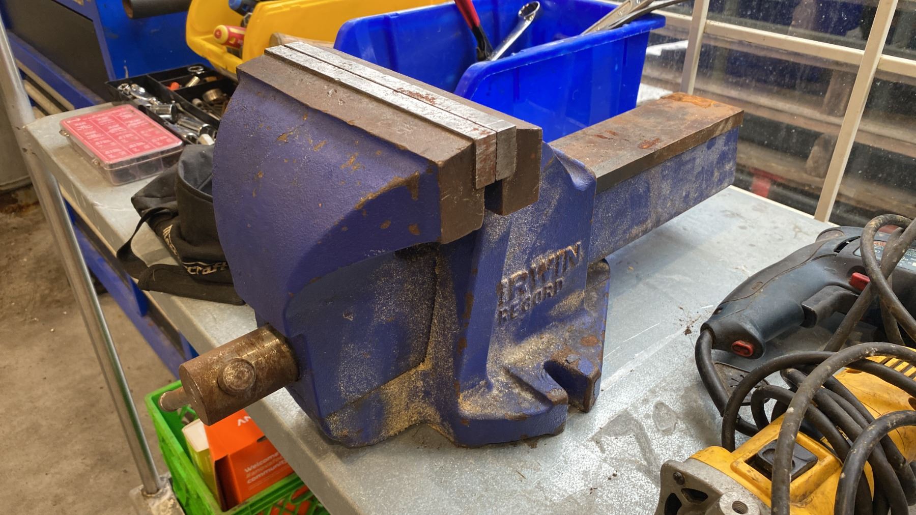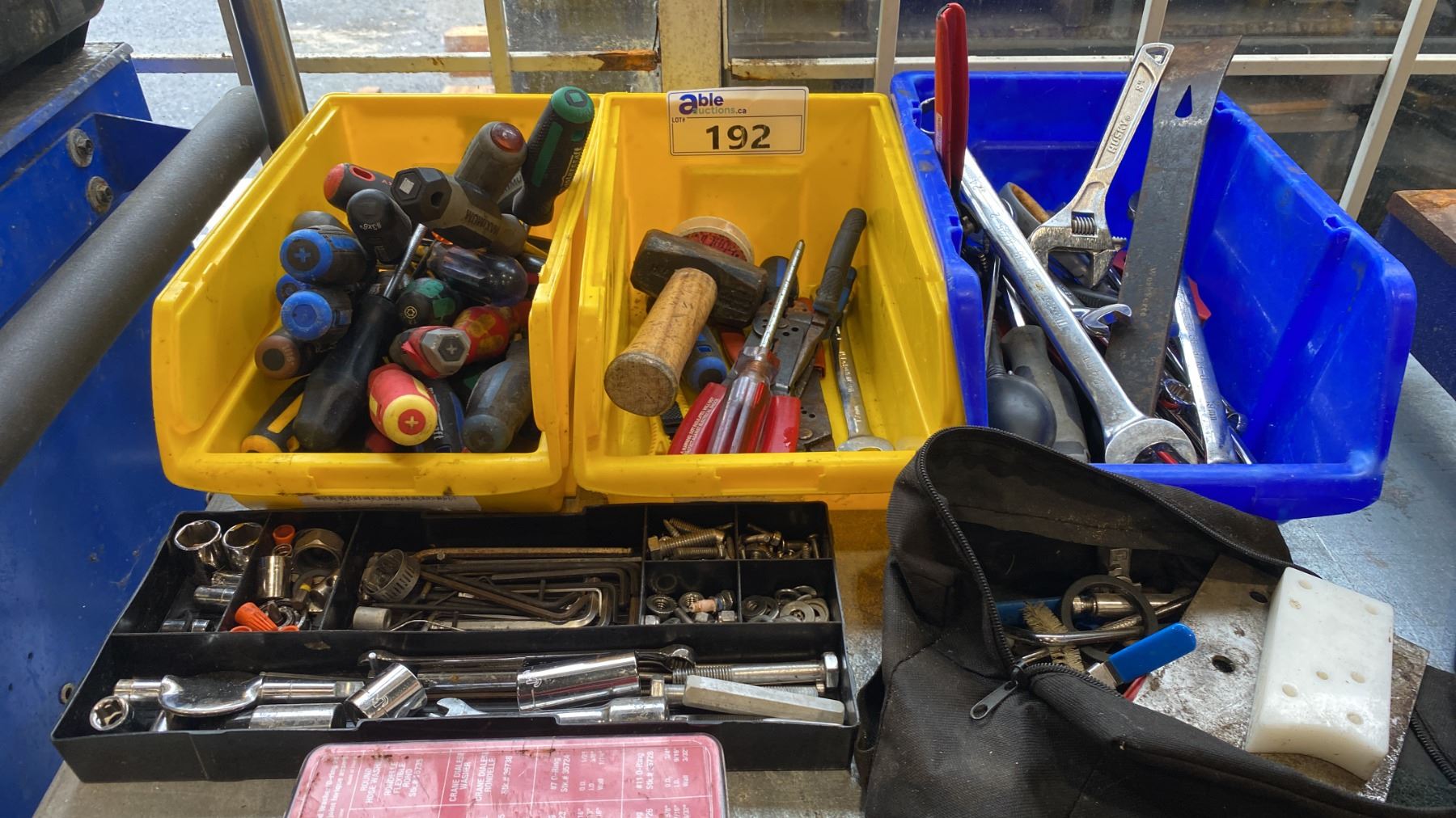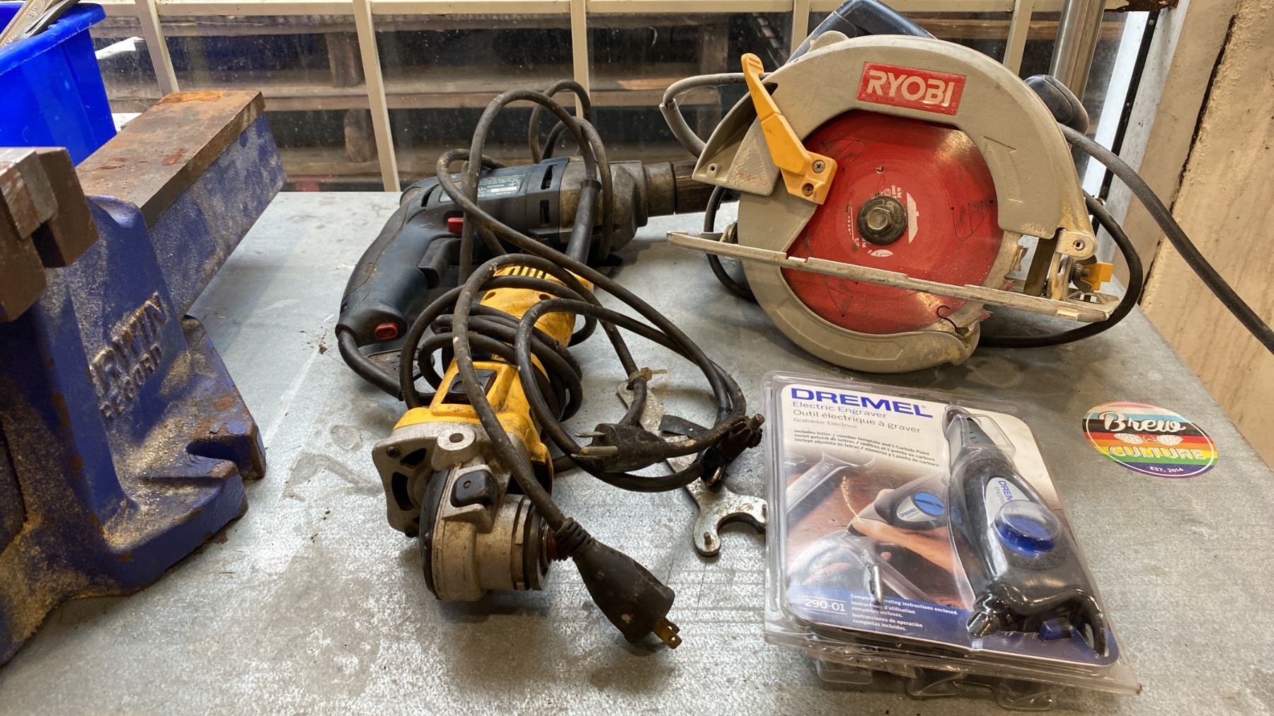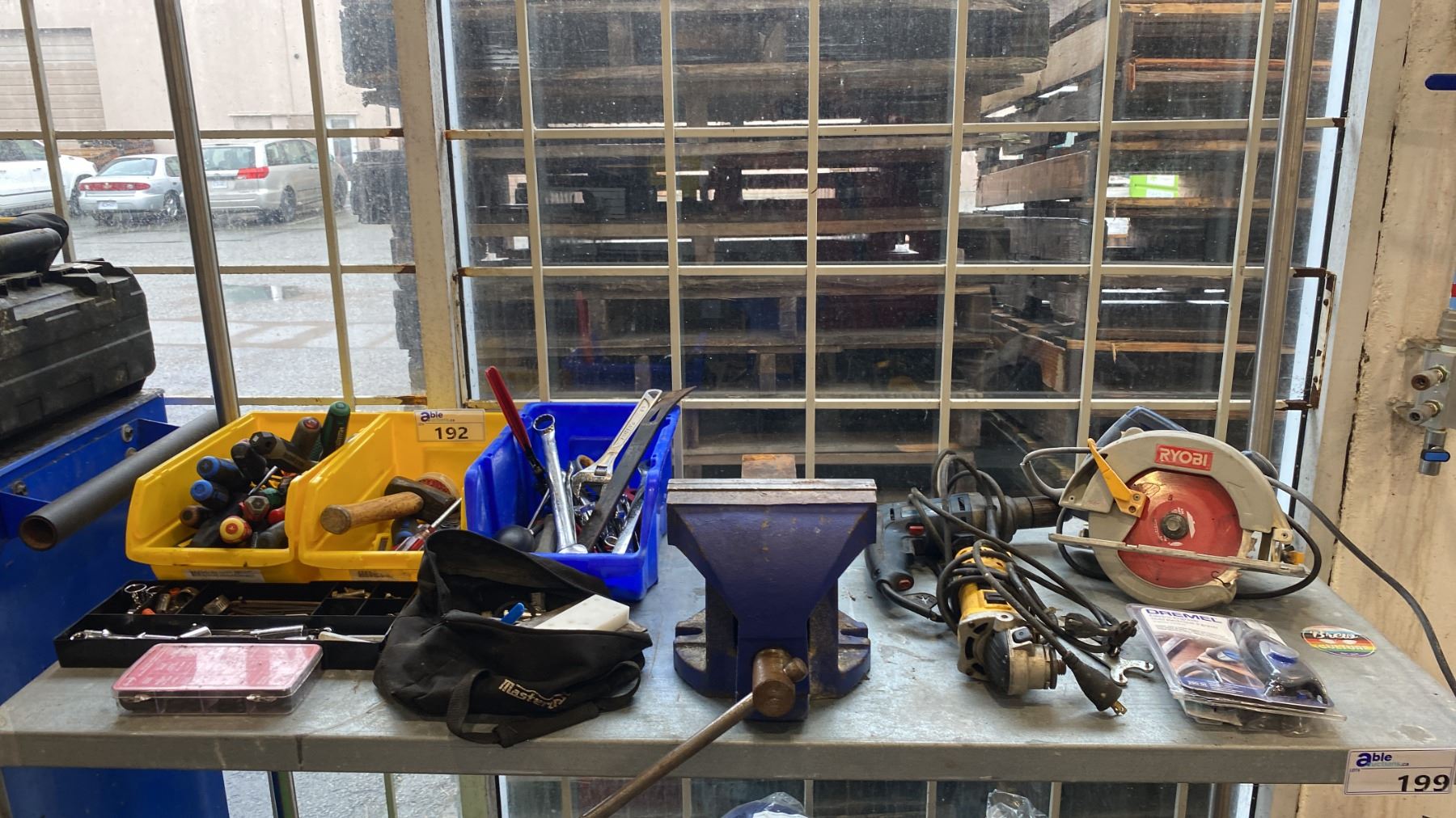 Lot 192 SHELF OF ASSORTED POWER TOOLS & HAND TOOLS, LARGE VISE AND PLASTIC ORGINIZERS