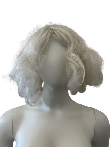 Custom made 18th century style,shoulder length, wavy without bangs, white colored wig from the film Mirror Mirror starring Julia Roberts and Lily Collins. The film is known for its elaborate fantasy costumes designed by Eiko Ishioka. Worn by a background character in the Queen's ballroom scenes.