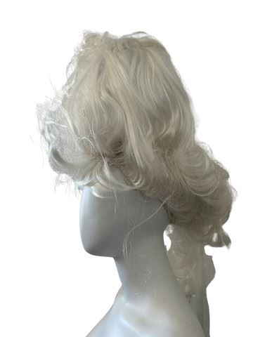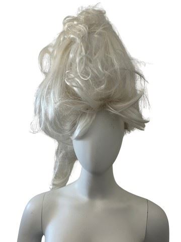 Marie Antionette/18th century style white, custom made wig for the film Mirror Mirror starring Julia Roberts and Lily Collins. The film is known for its elaborate fantasy costumes designed by Eiko Ishioka. Used on a background character in the Queen's ballroom scenes. Wig contains several bobby pins to hold it together. Made by Westbay.
