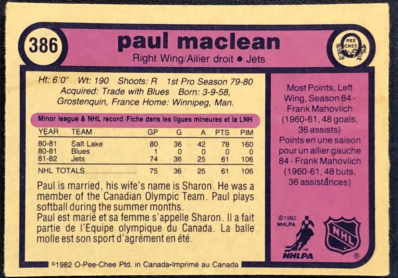 Lot 89 1982-83 O-PEE-CHEE PAUL MacLEAN ROOKIE CARD