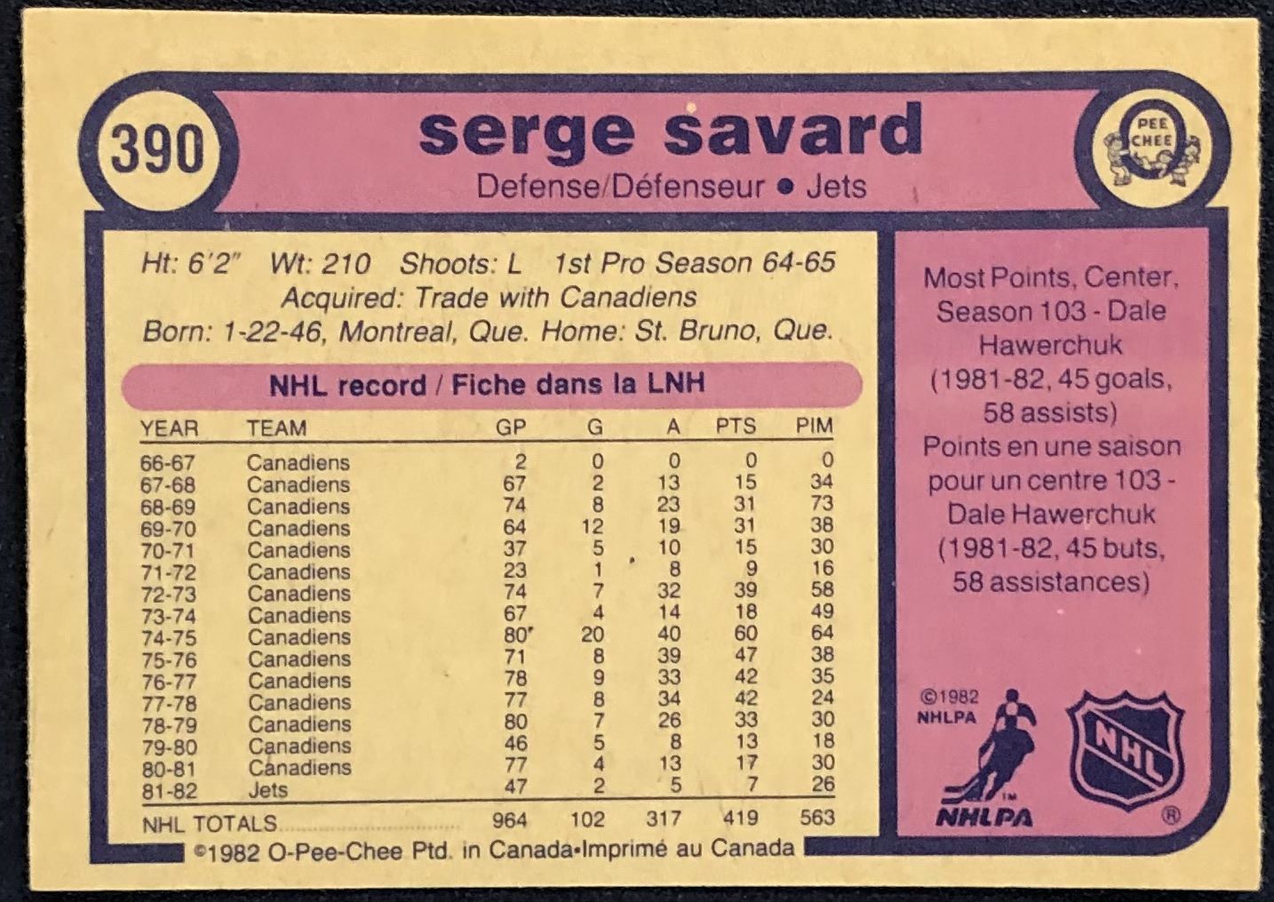 Lot 102 1982-83 O-PEE-CHEE SERGE SAVARD (HOF)