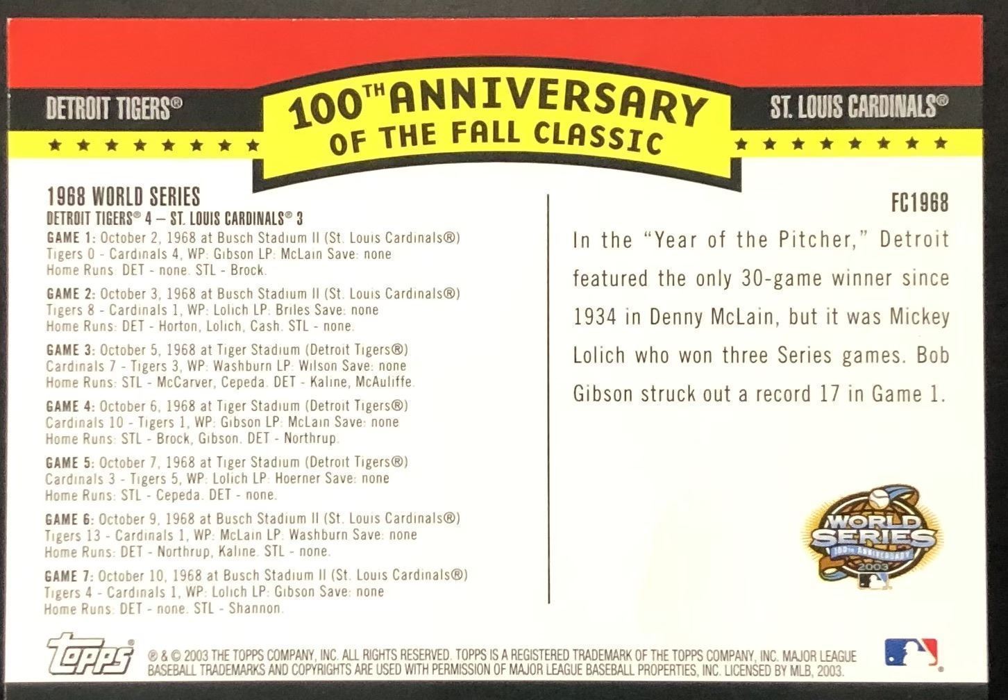 Lot 176 2003 TOPPS 100th FALL CLASSIC - DETROIT TIGERS 1968