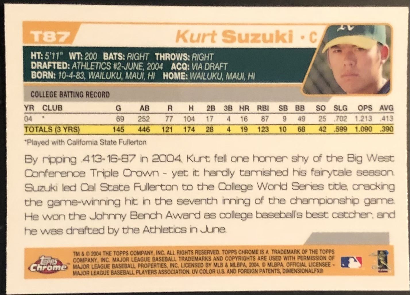 Lot 179 2005 TOPPS CHROME TRADED KURT SUZUKI ROOKIE CARD