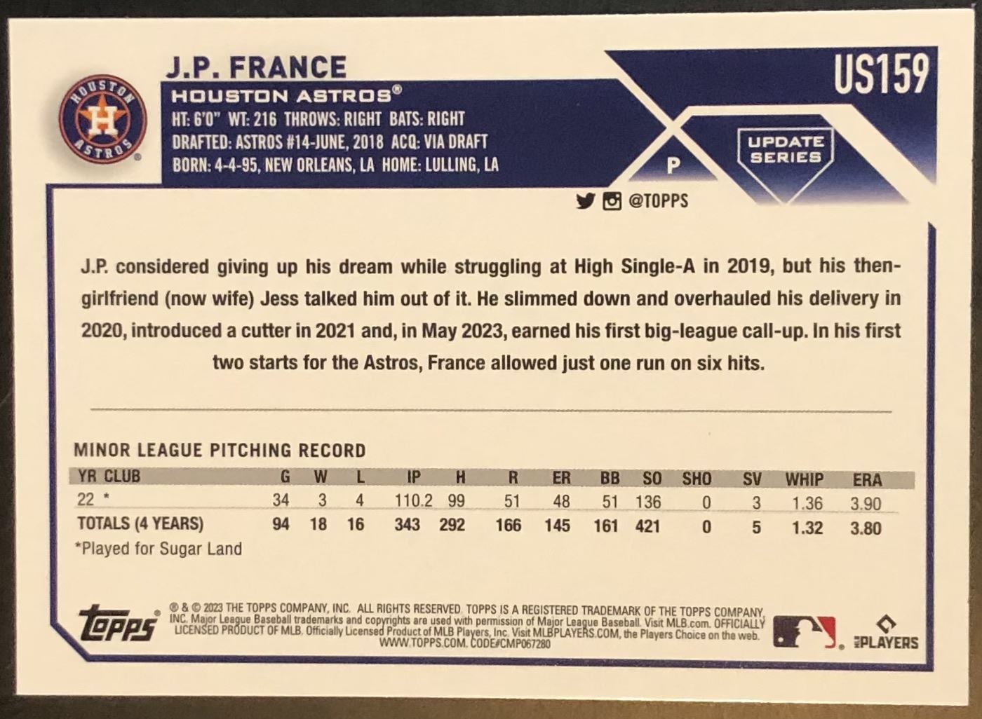 Lot 222 2023 TOPPS UPDATE J.P. FRANCE ROOKIE CARD