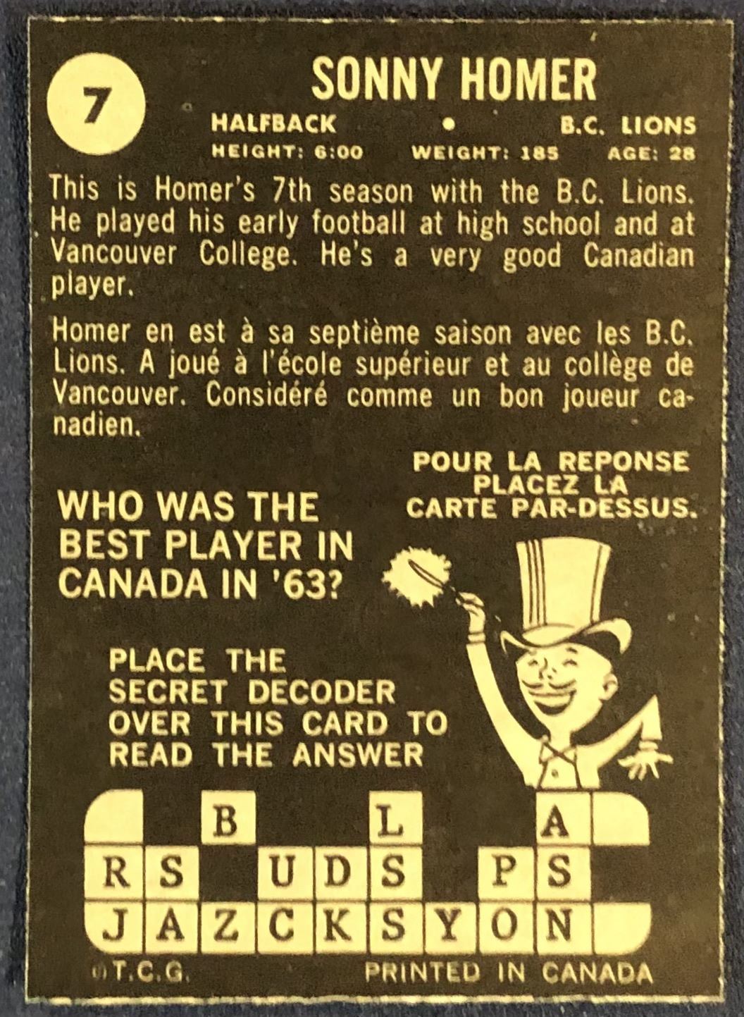 Lot 252 1964 O-PEE-CHEE CFL SONNY HOMER