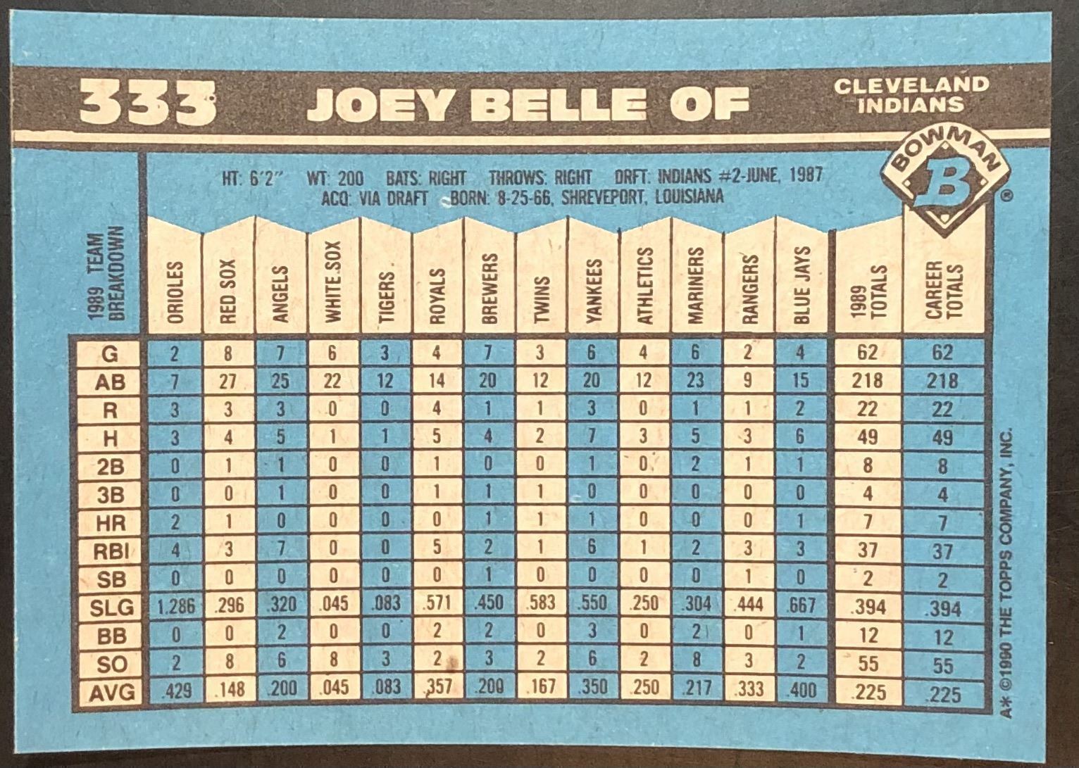 Lot 263 1990 BOWMAN JOEY 'ALBERT' BELLE ROOKIE CARD