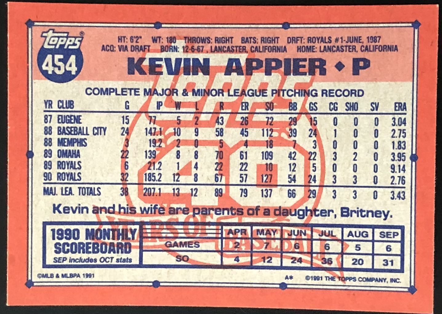 Lot 282 1990 TOPPS KEVIN APPIER ROOKIE CARD