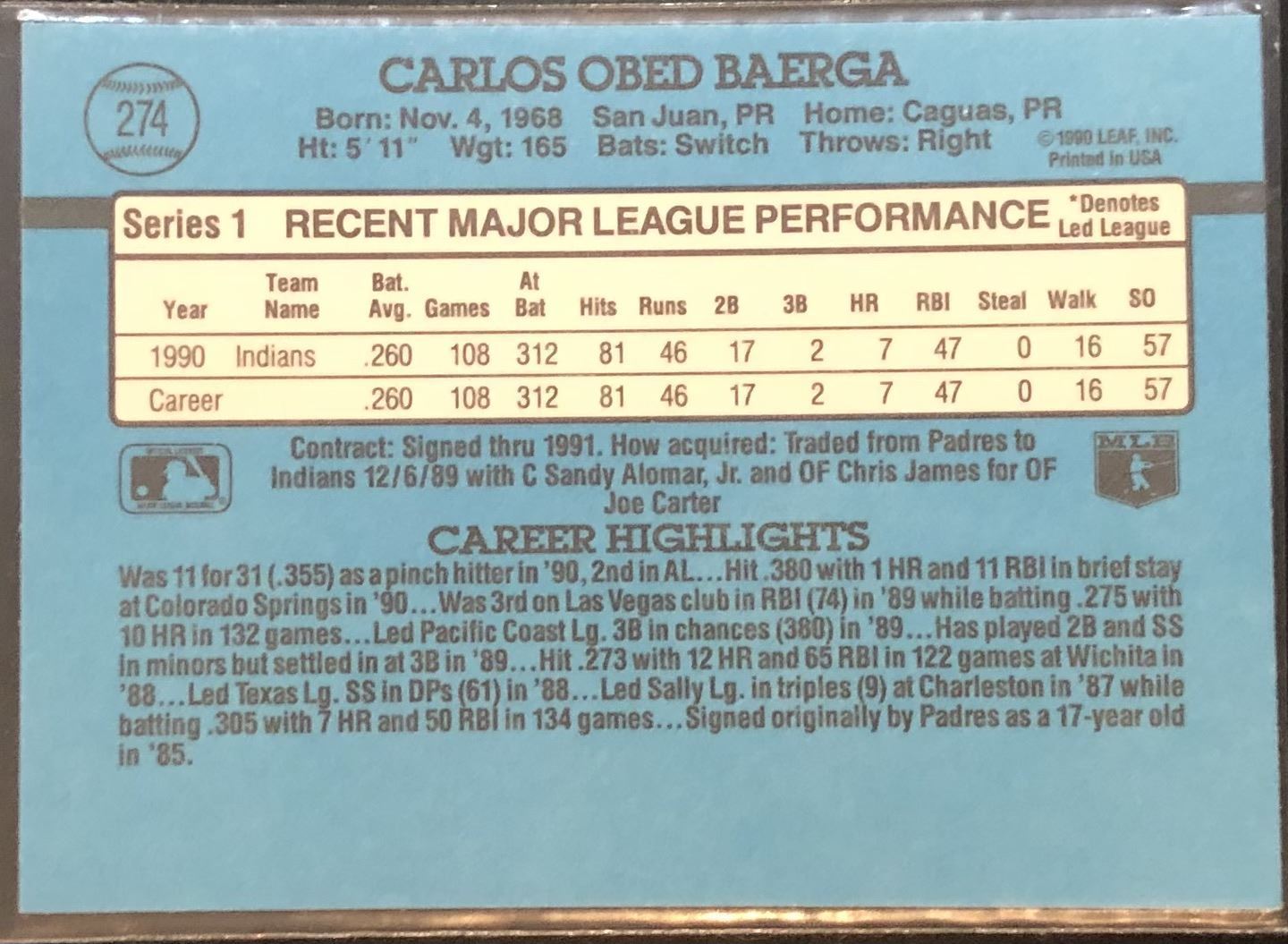 Lot 284 1991 DONRUSS CARLOS BAERGA ROOKIE CARD