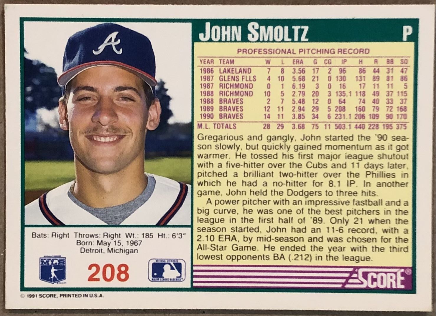 Lot 295 1991 SCORE JOHN SMOLTZ (HOF)